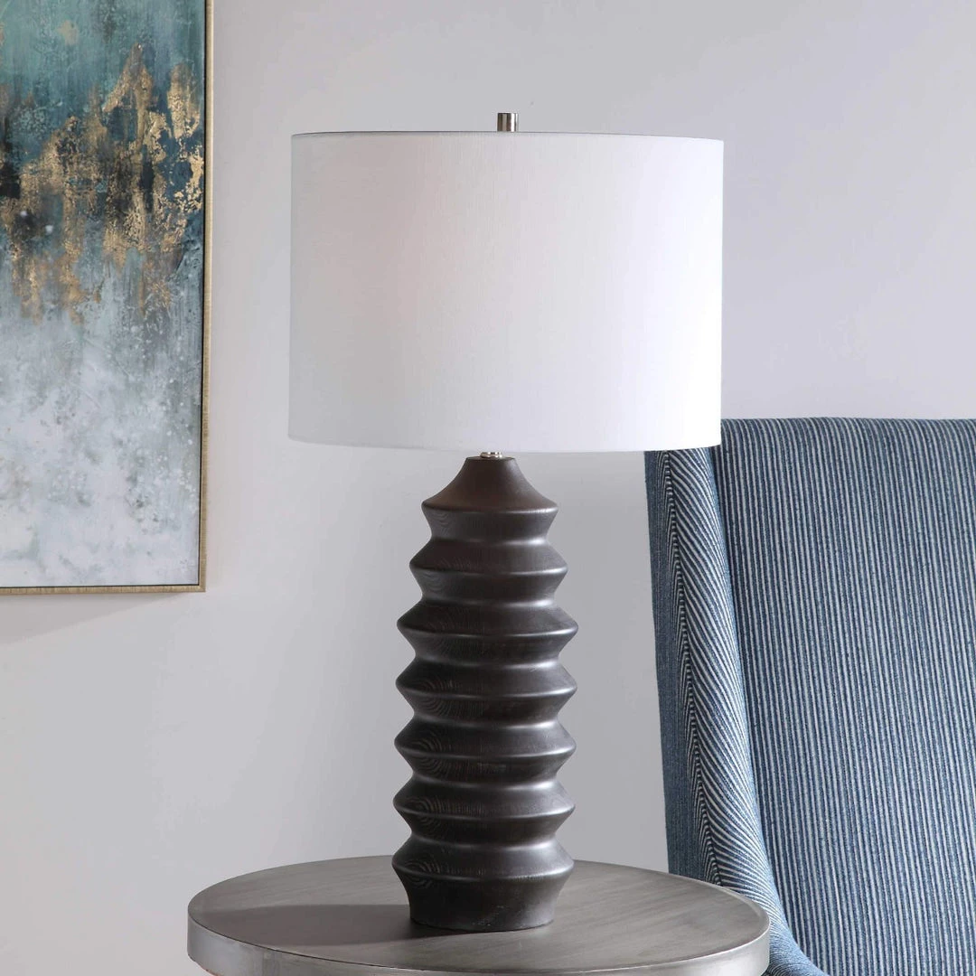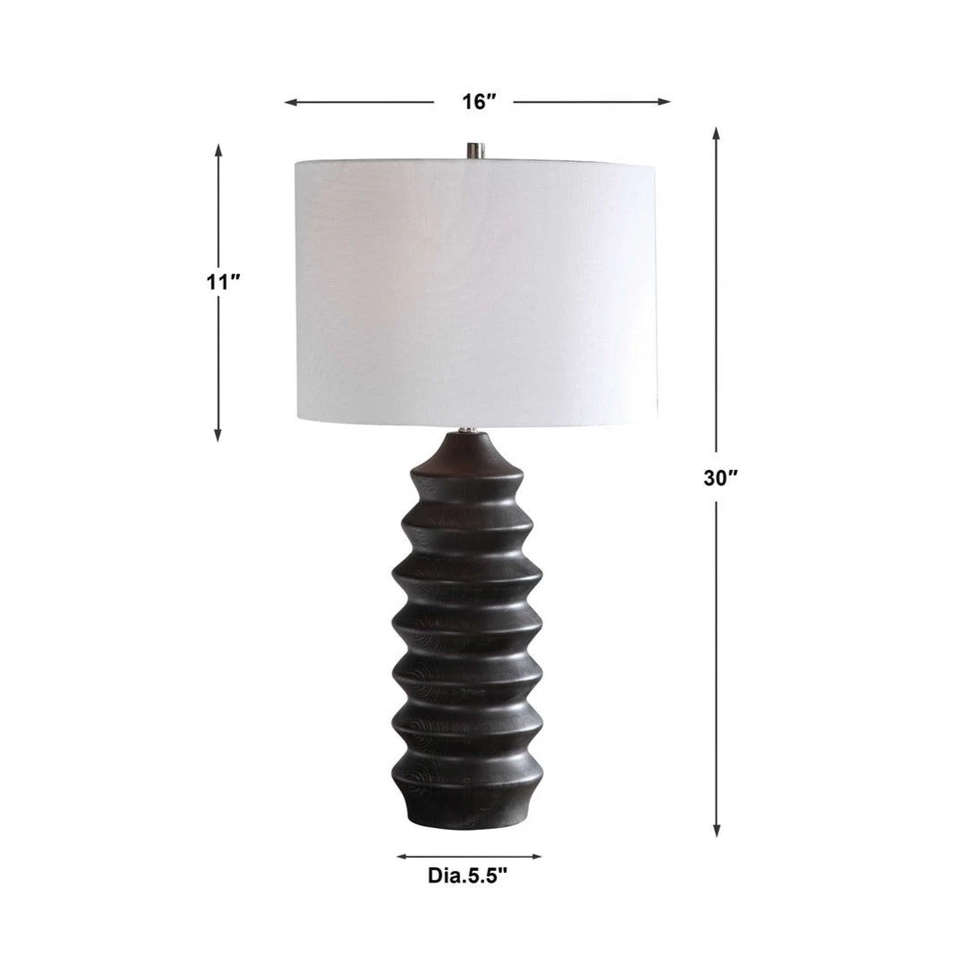 Showcasing a modern lodge style, this table lamp features a carved wood base finished in a rustic black stain exposing subtle wood grain. The lamp is paired with a round hardback drum shade in a white linen fabric.