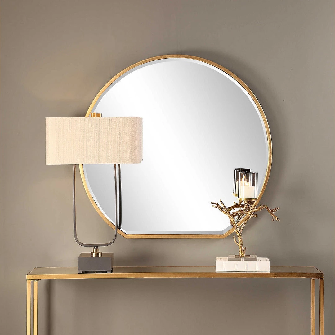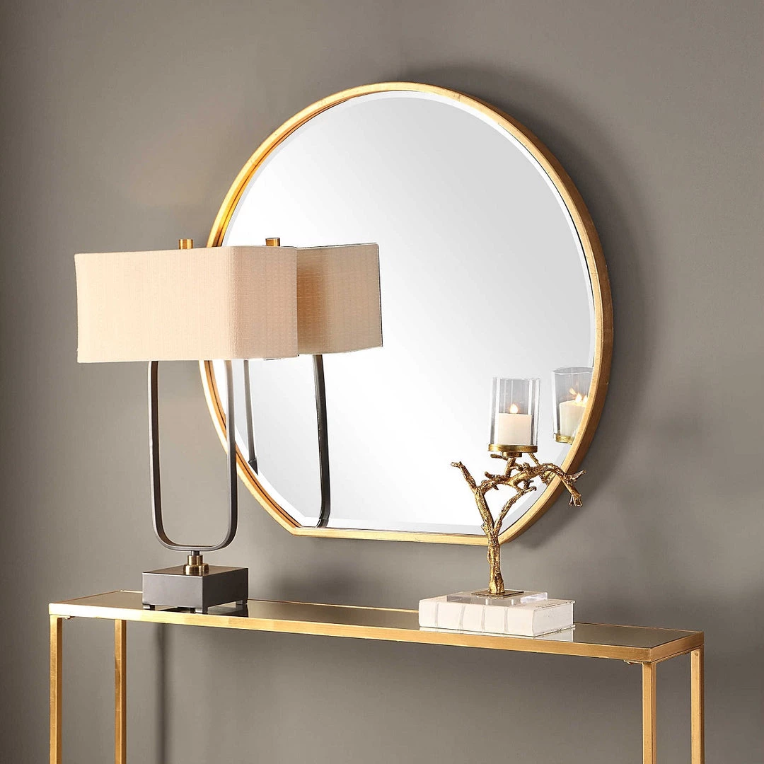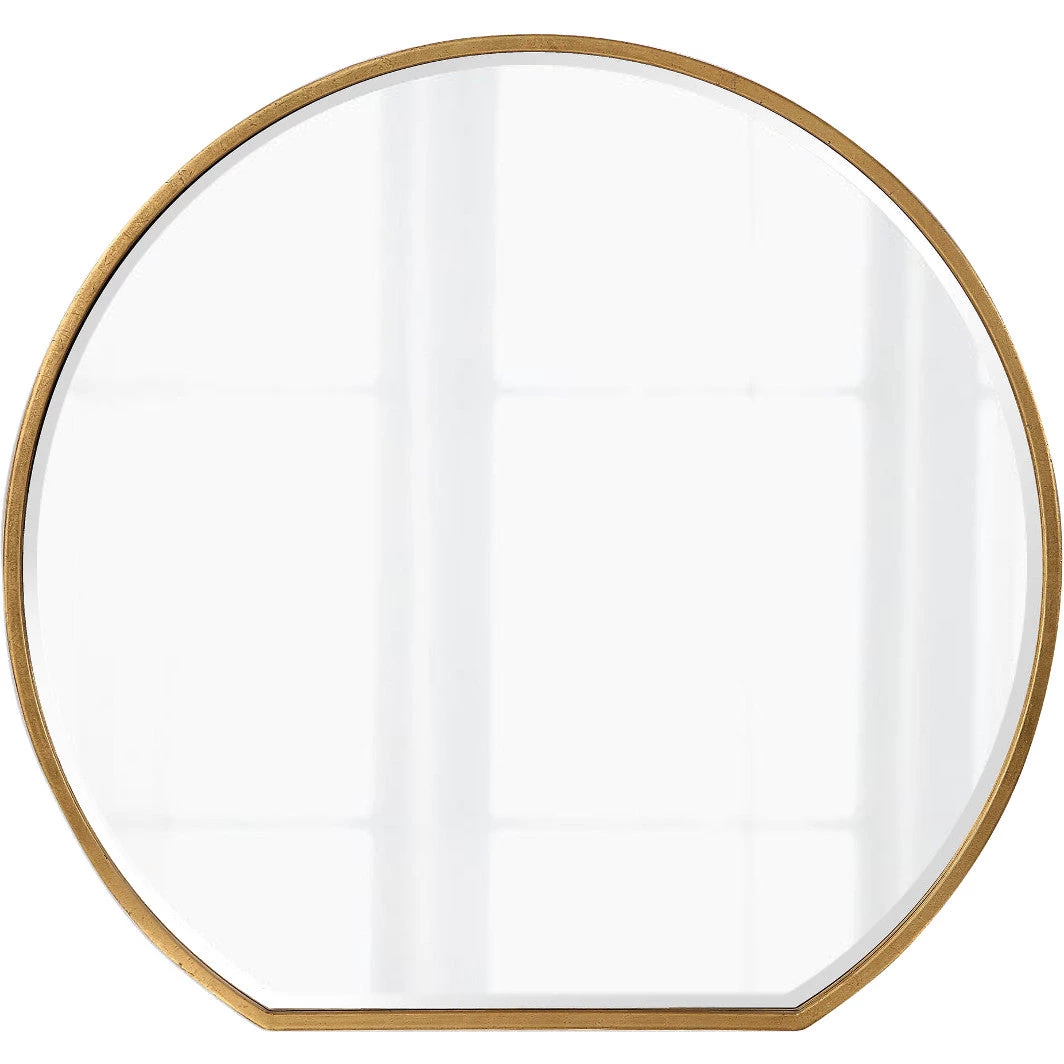 This unique iron frame features a delicate profile with ample depth, hand finished in a metallic gold leaf. Mirror features a generous 1 1/4″ bevel.