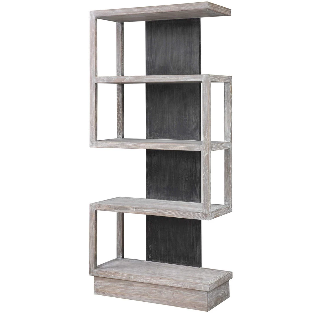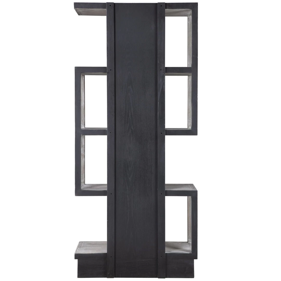 The dramatic contrast of this asymmetrical etagere gives an updated contemporary feel, featuring elm veneer shelving finished in light gray, accented with a deep black recessed panel with a light gray glazing.