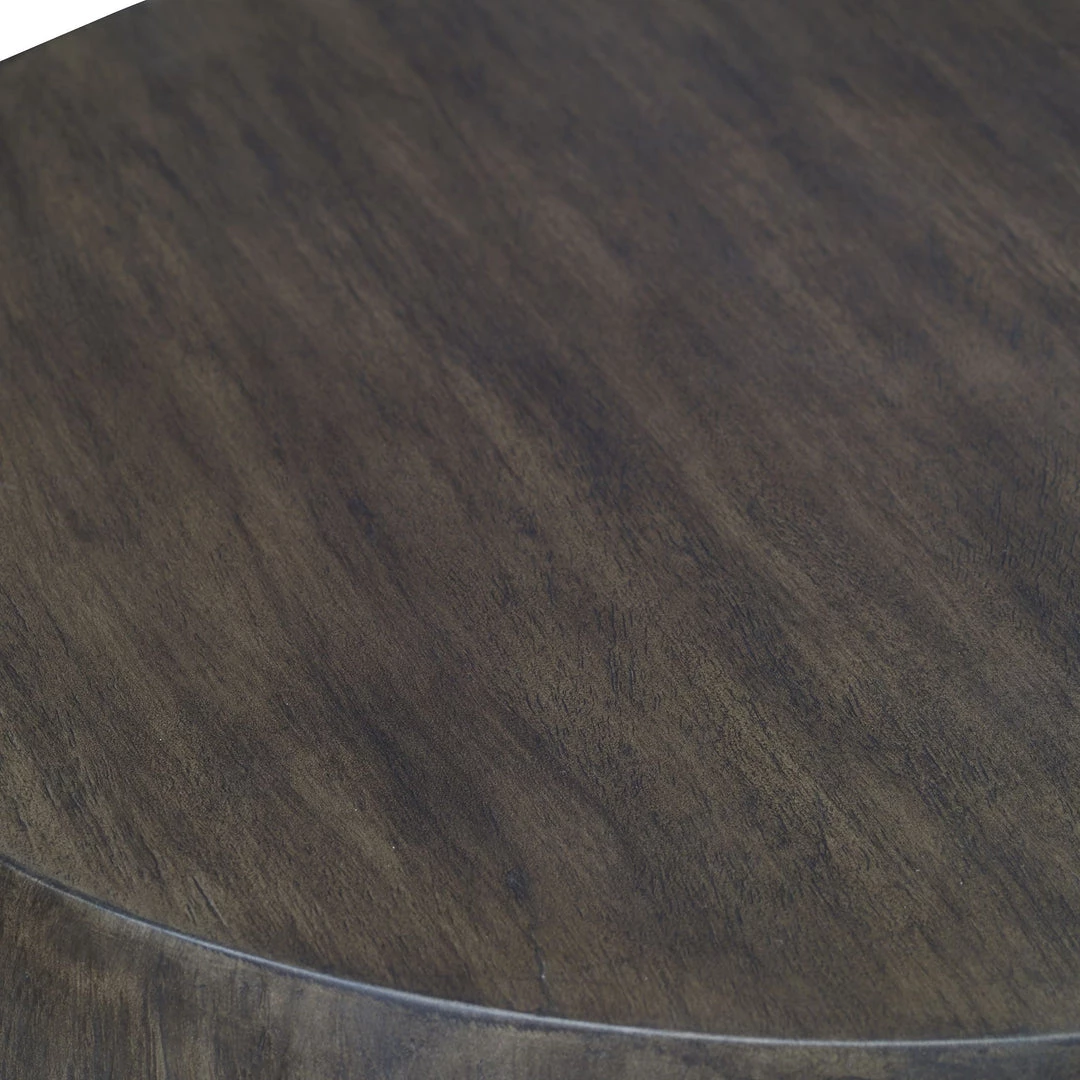 Showcasing a minimalist style, this round end table features a mango wood veneer overlay in a heavily textured aged walnut finish.