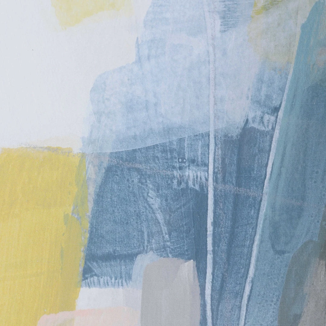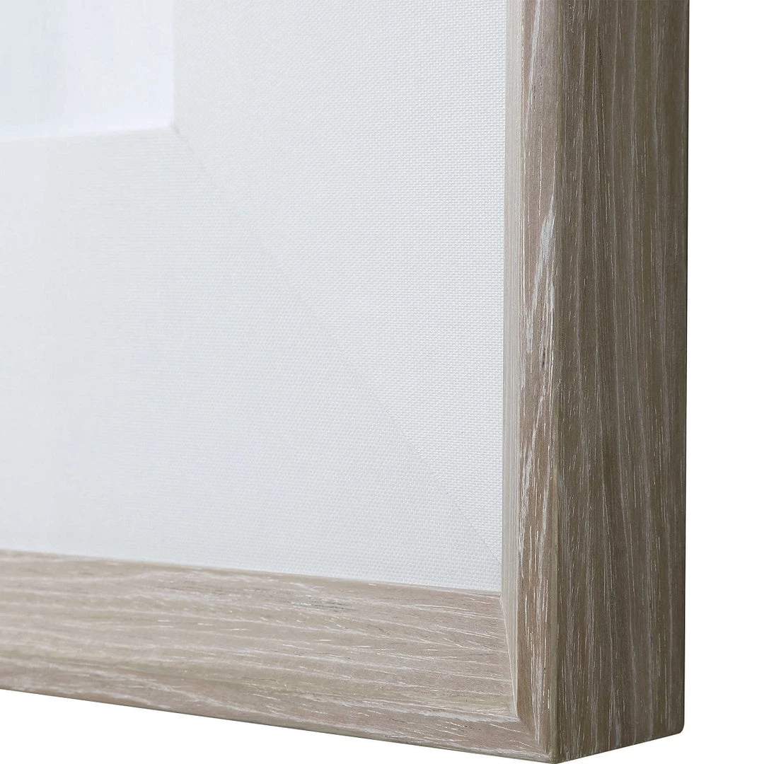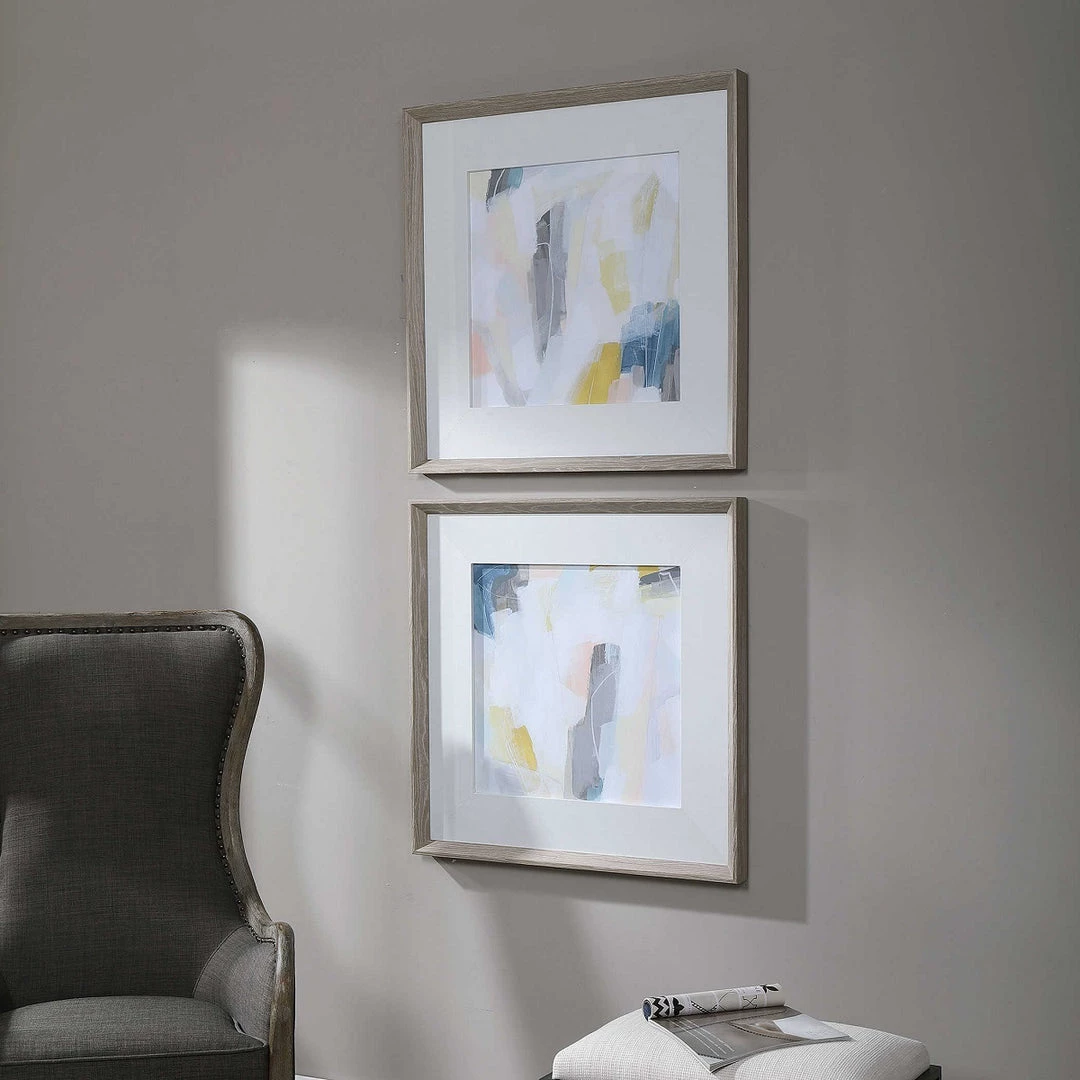 Paying homage to classic Scandinavian style, these abstract prints showcase an array of pastel color including yellow, peach, cobalt and charcoal gray. This fun artwork is accented by a white linen mat and a driftwood gray wooden frame with wire brushed details under glass.