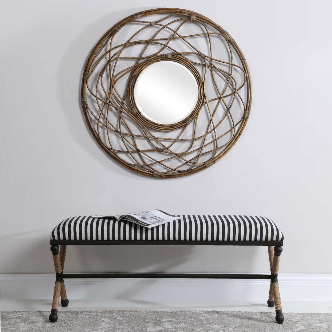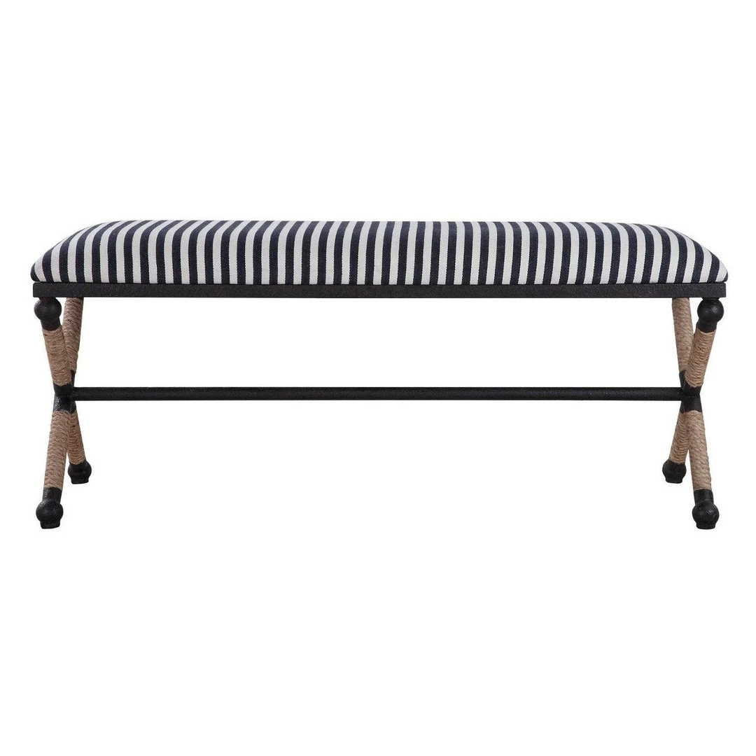 With its rustic iron frame wrapped in natural fiber rope accents the Braddock bench exudes a timeless beauty with a striped cotton cushion in navy and white. Braddock is lovely as nautical chic bedroom bench.