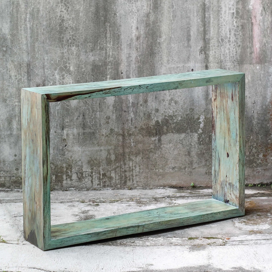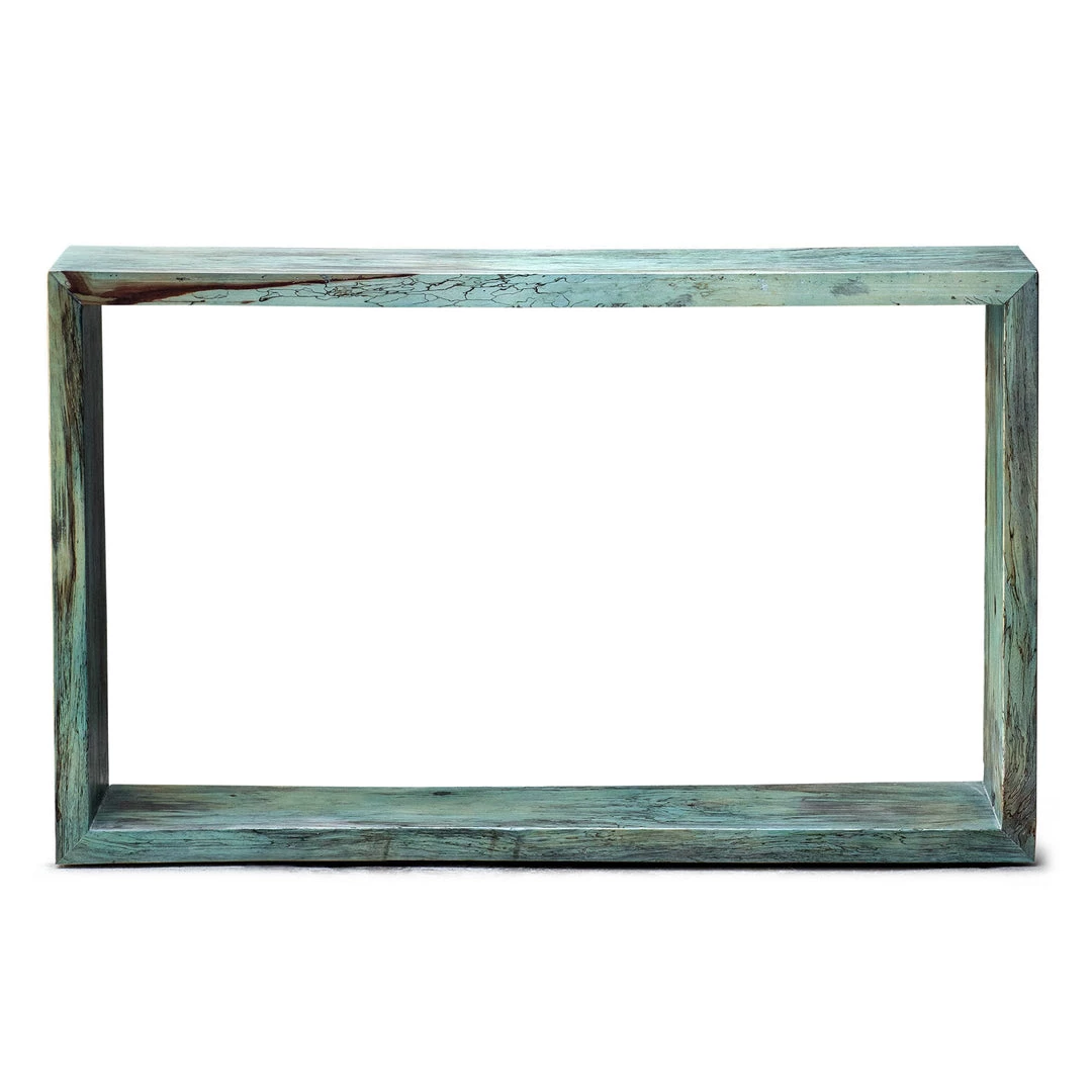 This fun statement console table features naturally spalted tamarind wood, finished in a soft Caribbean blue-green.