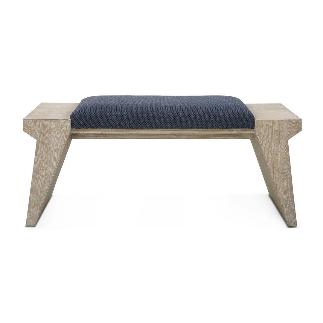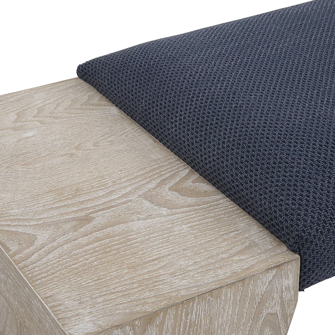 The Davenport bench adds a modern coastal touch with its asymmetrical legs in cerused fir wood exposing the natural wood grain, upholstered in a rich navy blue cotton blend fabric.