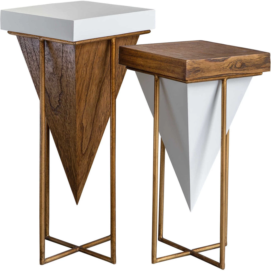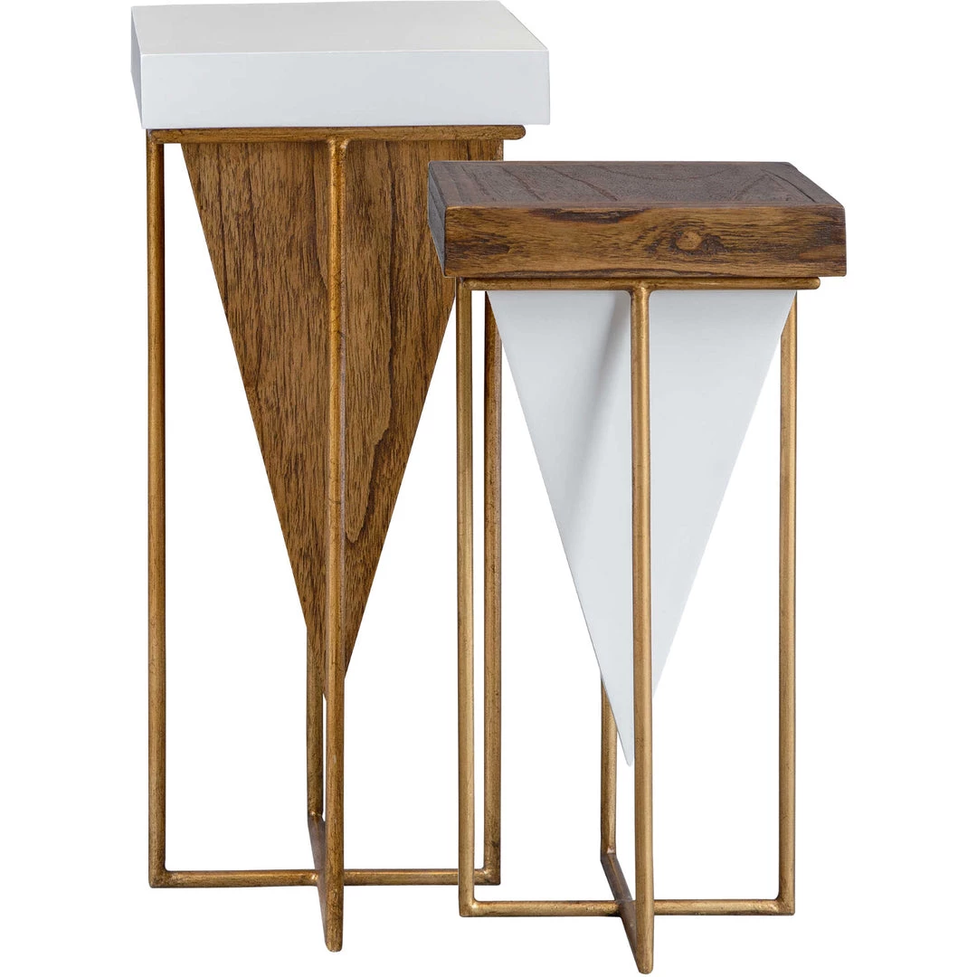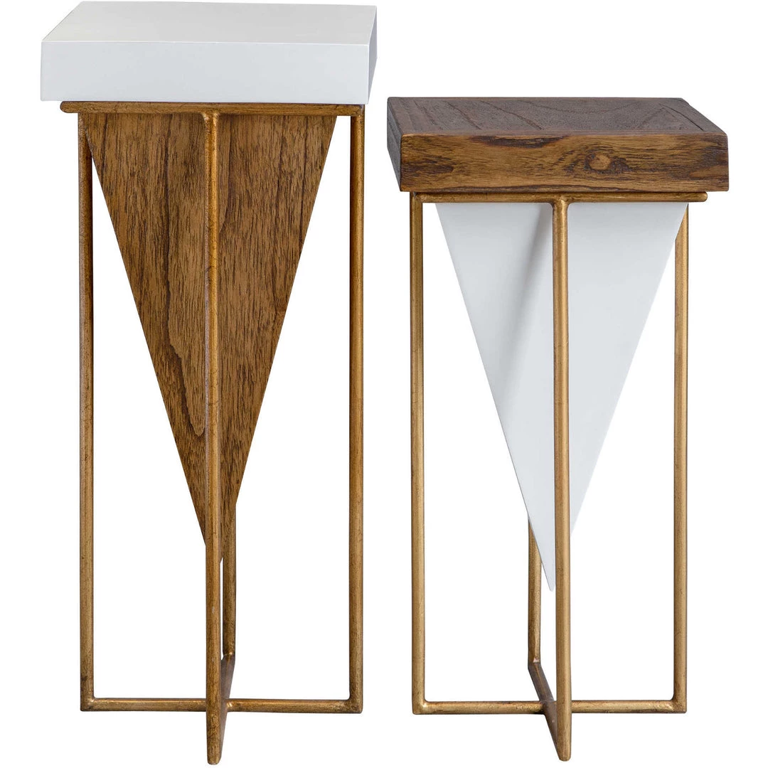 Scandinavian inspired, this set of 2 accent tables is finished in alternating gloss white and walnut finished mini veneer atop antique gold finished bases.