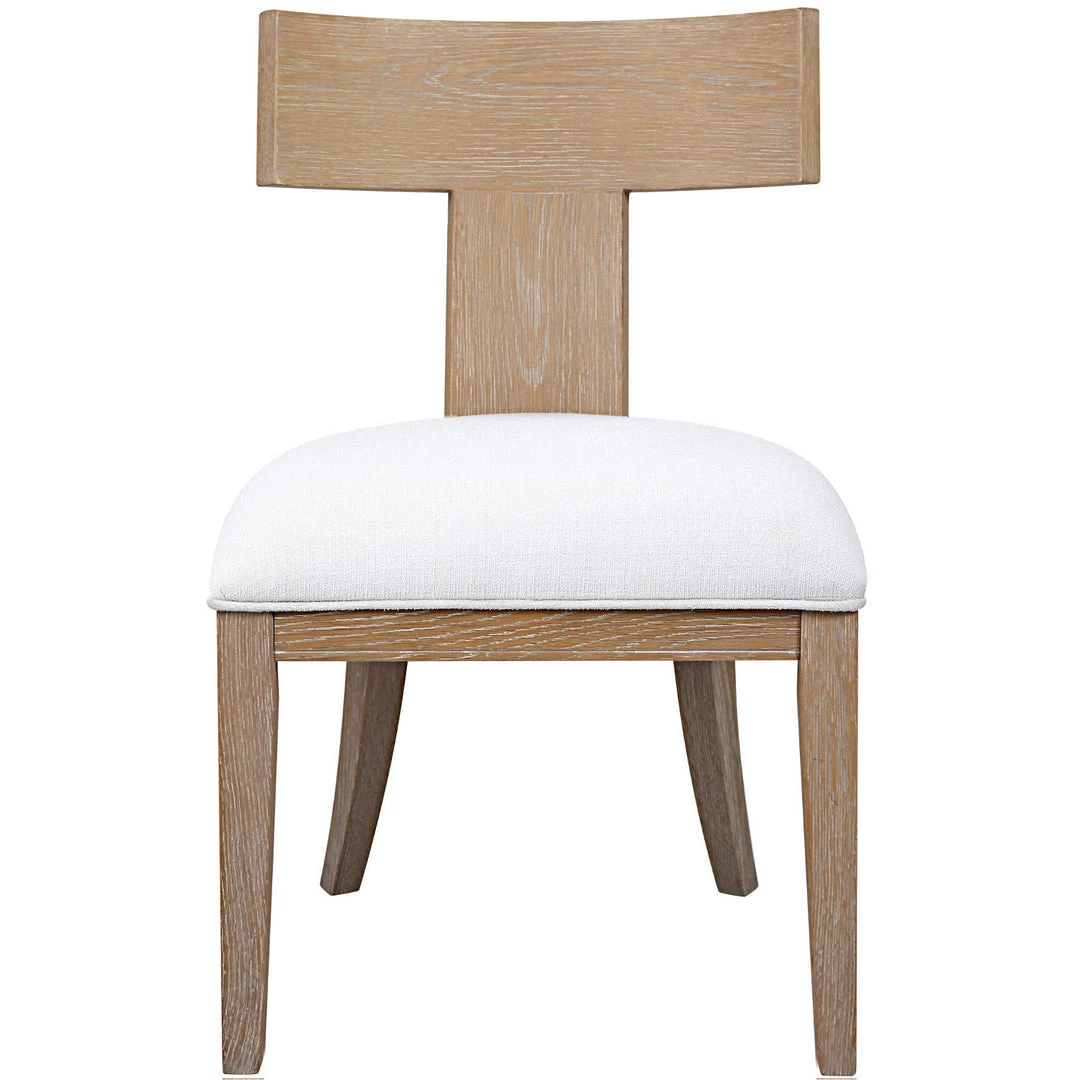 A casual take on a classic design, this klismos style chair features an oak wood frame with a natural oak finish, paired with a white slubbed performance fabric cushion.