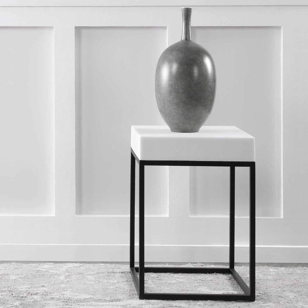 This modern accent table combines a white marble look, atop a simple steel base finished in aged black.