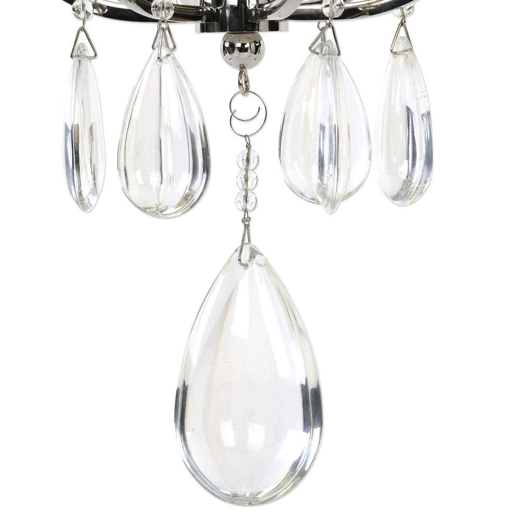 Graceful 6 Lt. polished nickel square arm chandelier with the petite arms floating on the outside of the center candle cluster in a unique genie bottle shape enhanced with clear glass drop accents at both the top and bottom of the chandelier.