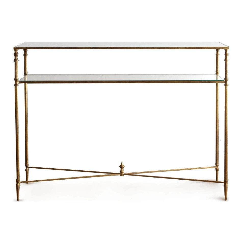Forged iron frame and iron cross stretchers in antiqued gold leaf. Top is reinforced mirror and gallery shelf is clear tempered glass.