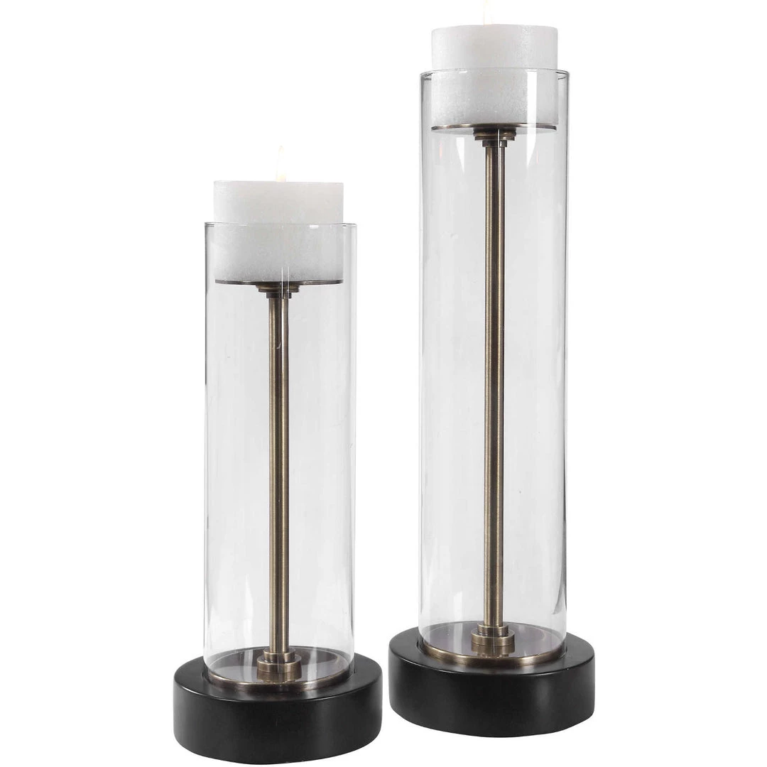 This set of two candleholders feature an aged brass stand surrounded by a clear glass hurricane and finished with a thick bronze foot.