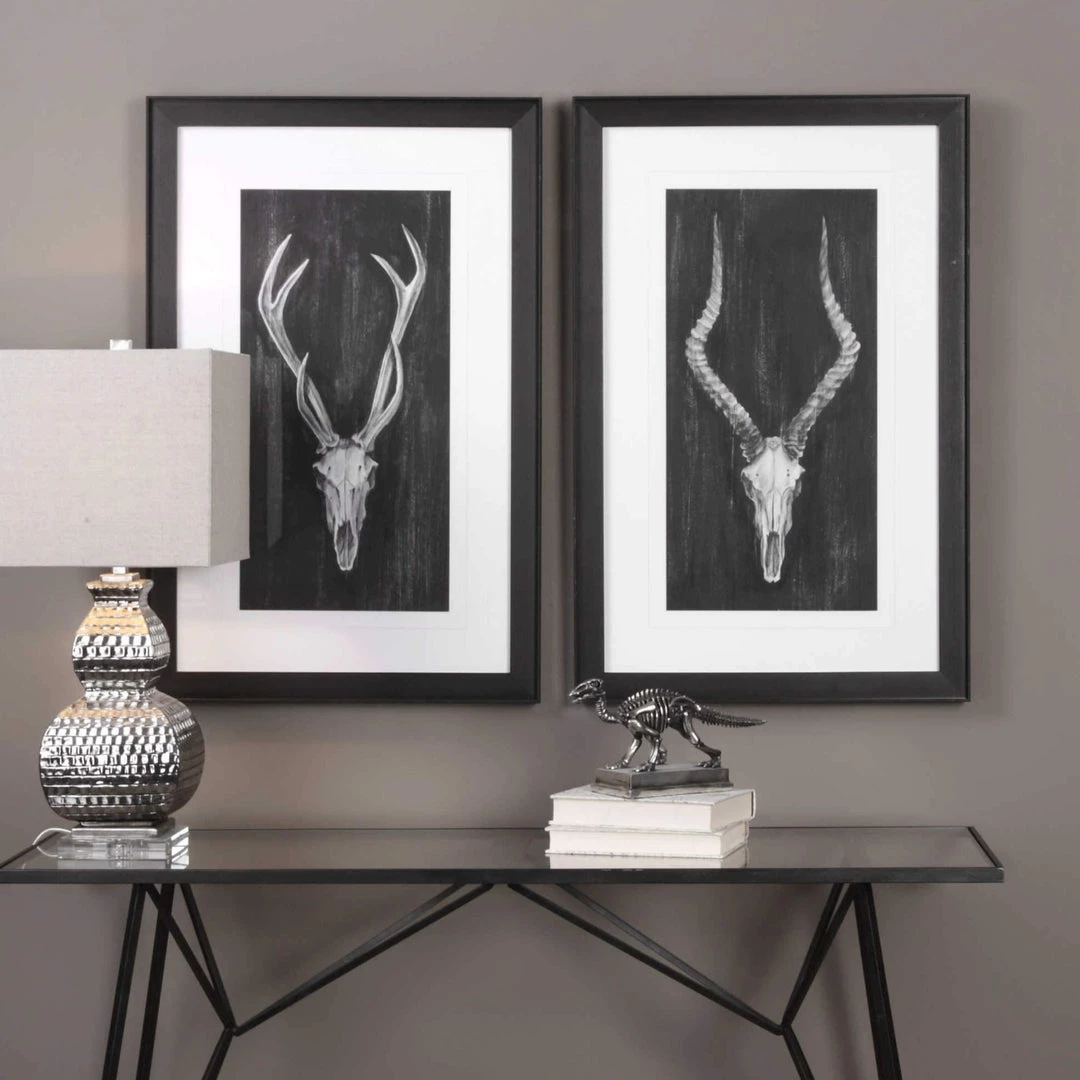 This pair of horned animal skull prints are the perfect combination of rustic and modern. The black and white prints are accented by clean, large white mats with v-groove detailing. The minimalist design is completed by a classic black wooden frame and set under protective glass.