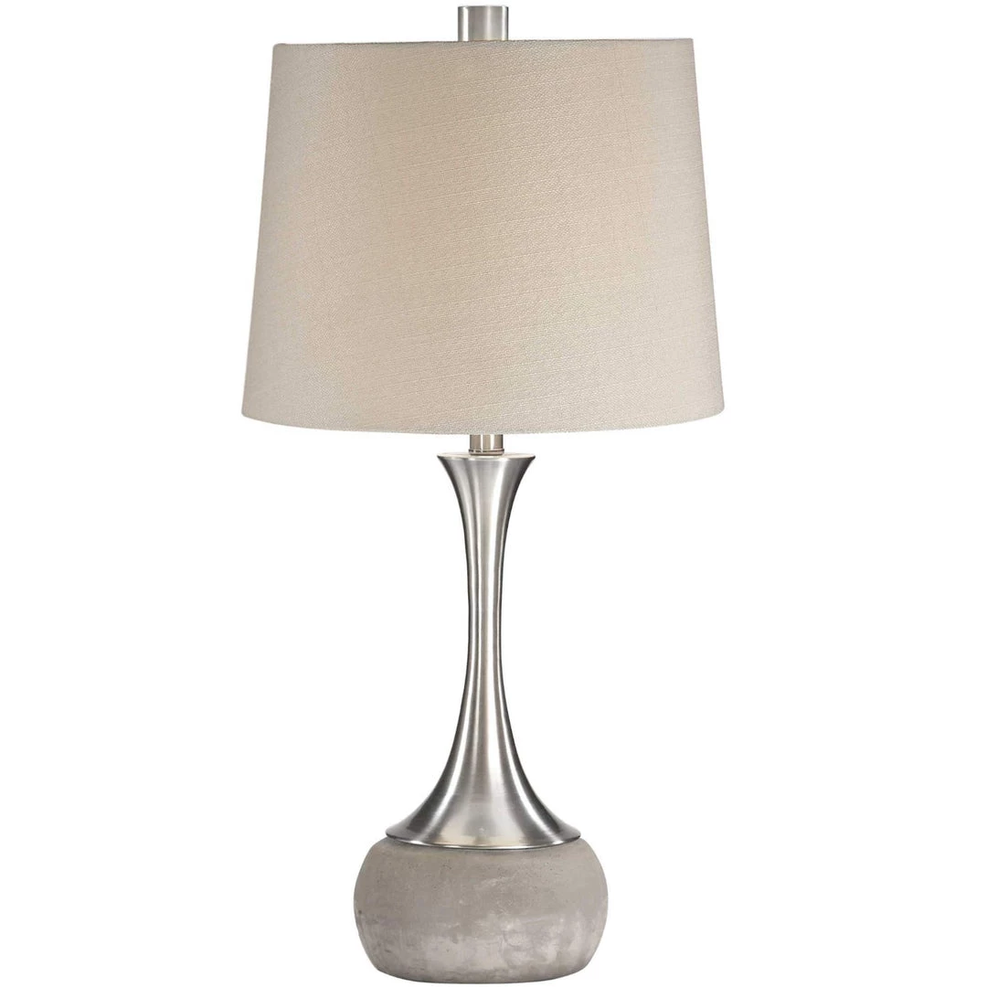 This sleek spun metal base features a plated brushed nickel finish, displayed on a smoothed natural concrete foot. The tapered round hardback shade is a light gray, coarse weave linen fabric.