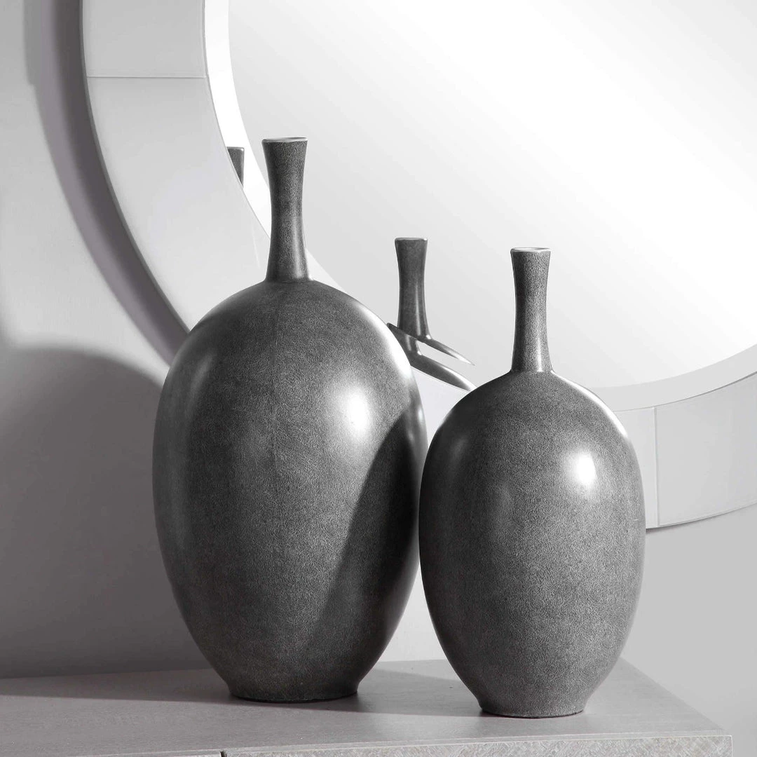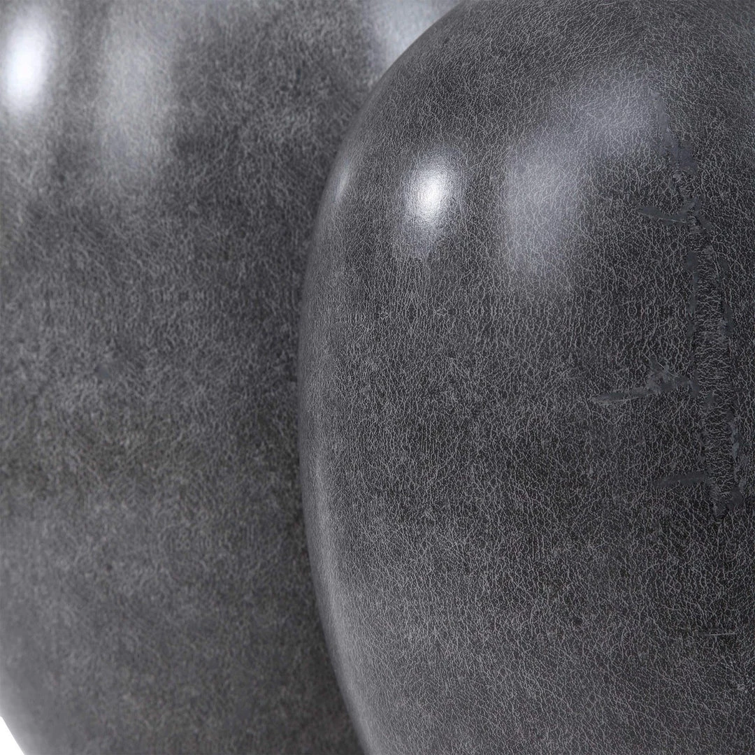 Made from ceramic, these contemporary vases feature a marbled black and white exterior with a matte white interior.