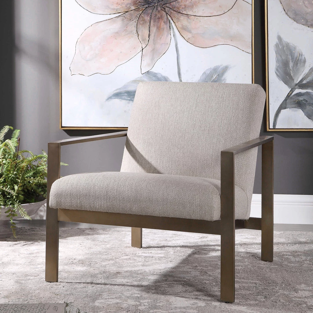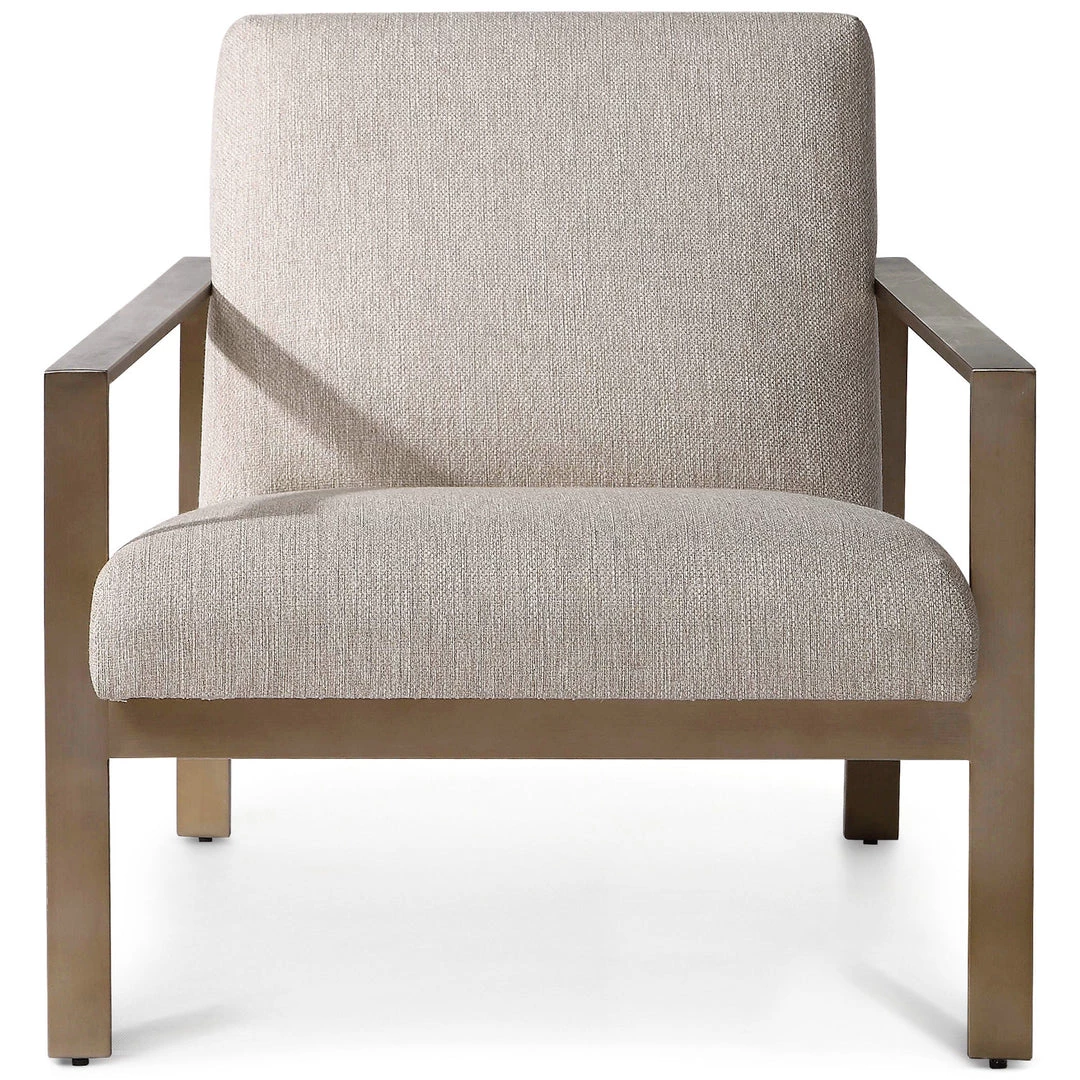 With clean contemporary lines, this open frame design features a stainless steel construction finished in antique brushed brass with comfortable box seat cushions tailored in a treated warm oatmeal woven fabric.