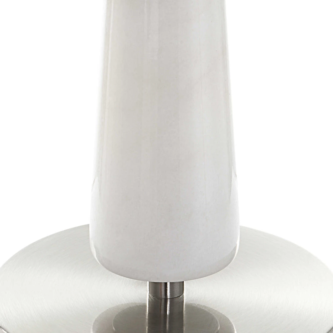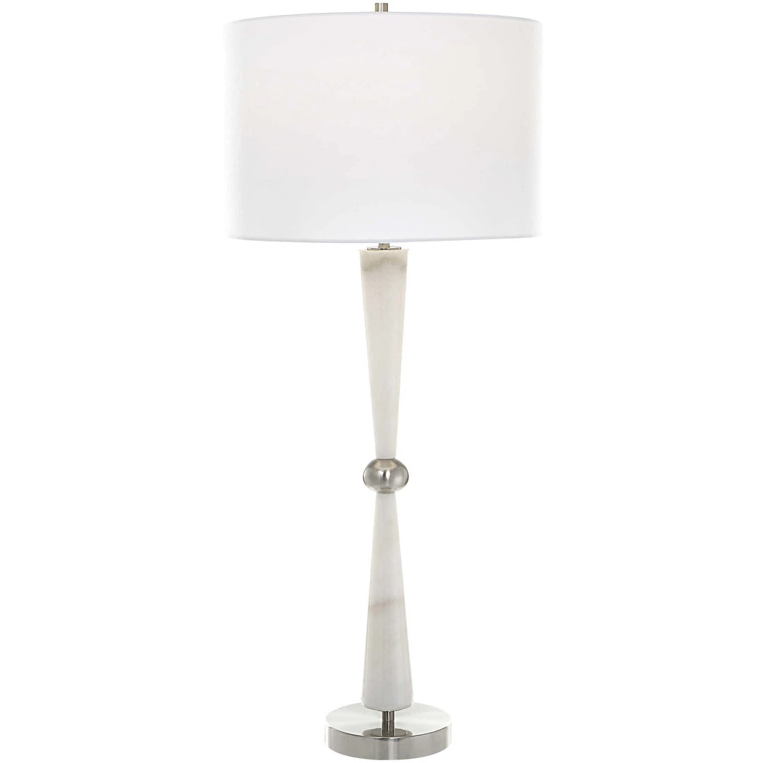 Timeless and sophisticated, this table lamp boasts tapered white marble with subtle gray veining, accented by iron details finished in brushed nickel. A white hardback drum shade completes this piece.