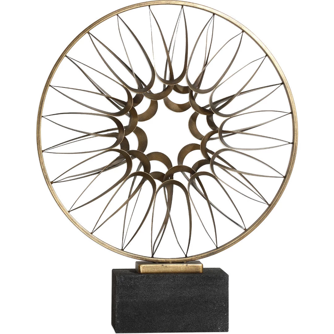 A perfect console accessory, the Kente Antique Bronze Sculpture is modern but with ethic flare. The disk set atop a textured black concrete base.