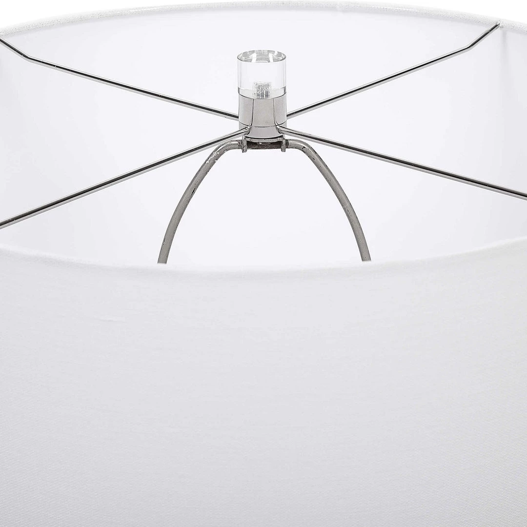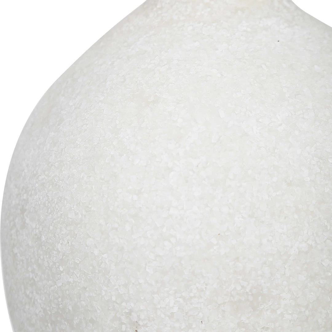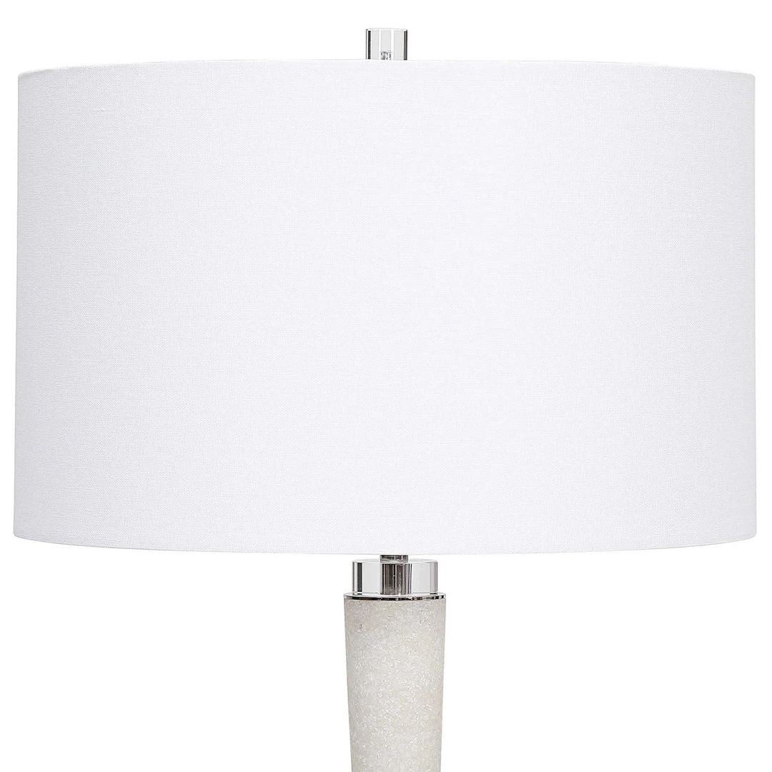 This elegant table lamp is executed in a rich looking material made of granulated white marble that accurately replicates the look of Thassos marble, accented by thick crystal details. A white hardback drum shade completes the lamp.
