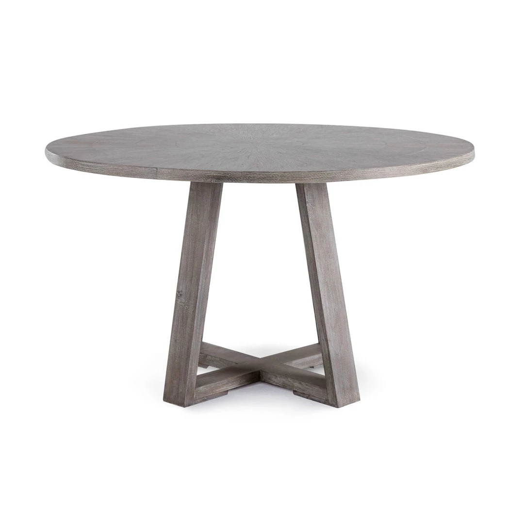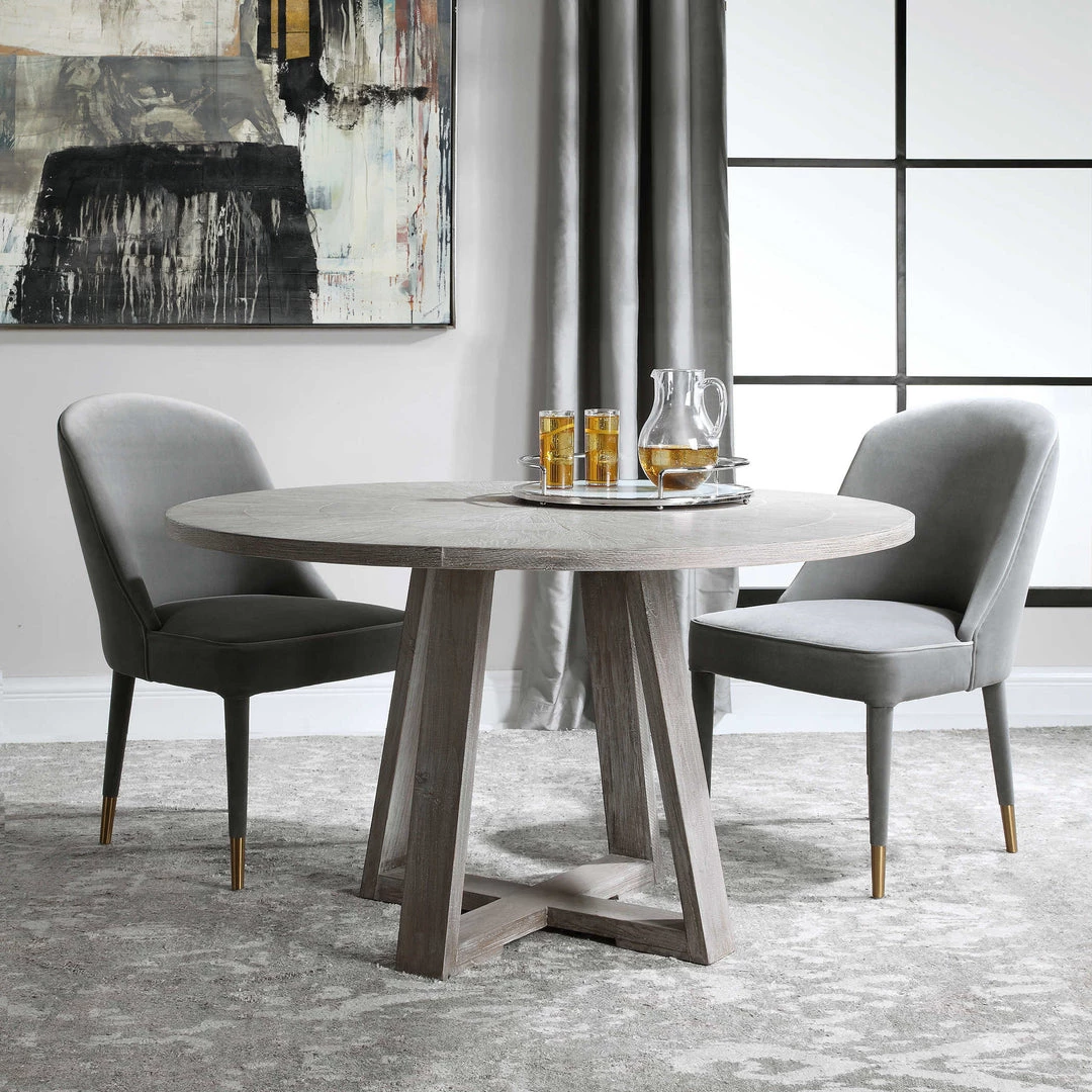 A welcoming, round modern farmhouse table draws the eye with its richly grained oak veneer inlaid top and sturdy elm wood trestle base. Finished in a soft gray with hints of brown undertones, this casual round table is perfect for creating a cozy dining space.