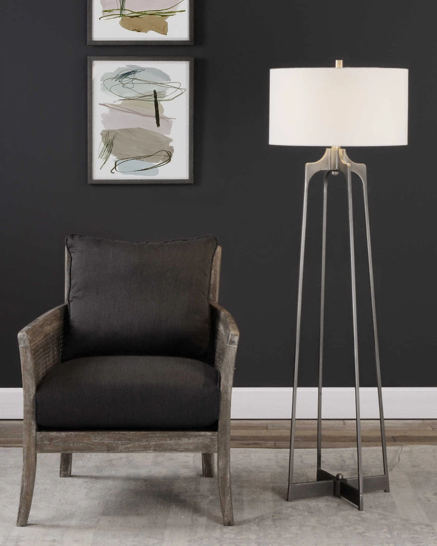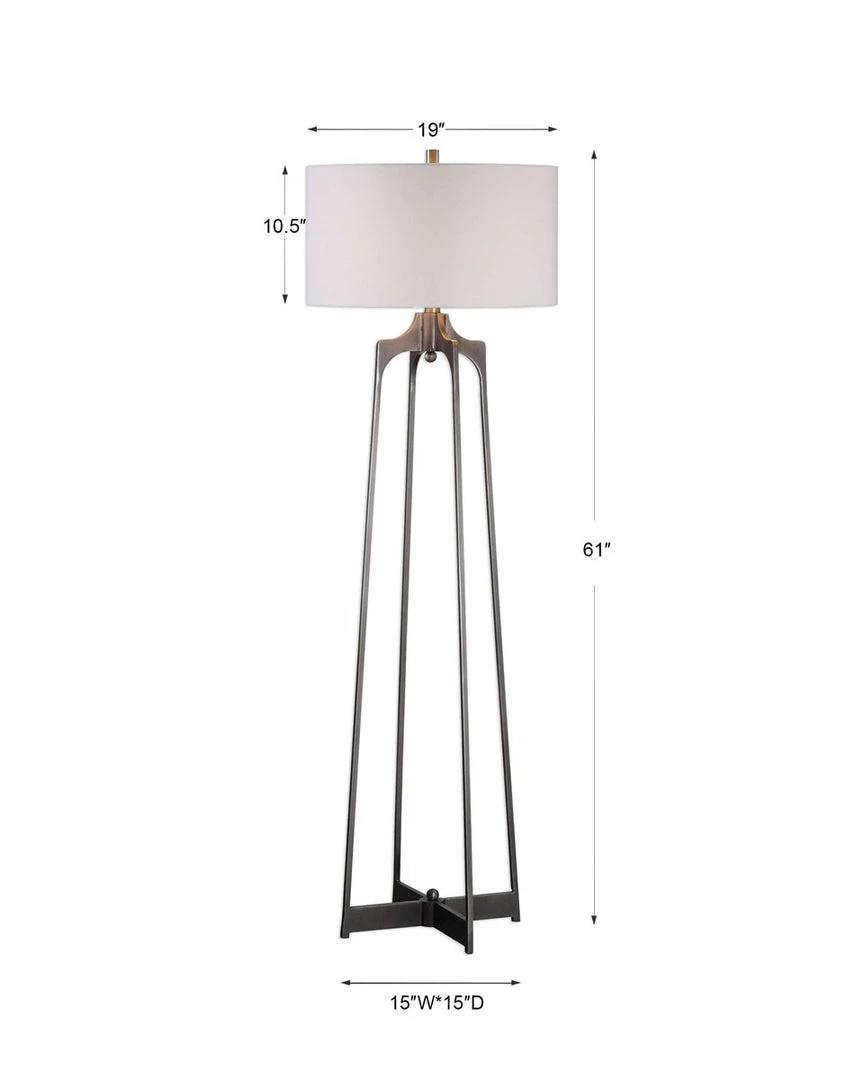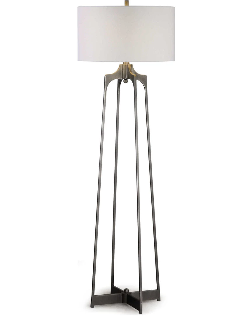 Sleek and refined, this lamp is constructed of forged steel, finished in a plated aged gun metal. The round hardback drum shade is a white linen fabric with natural slubbing.