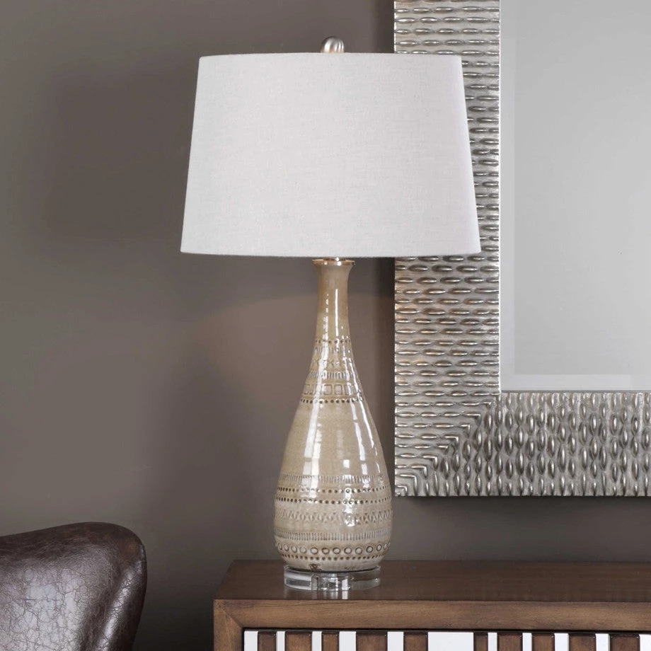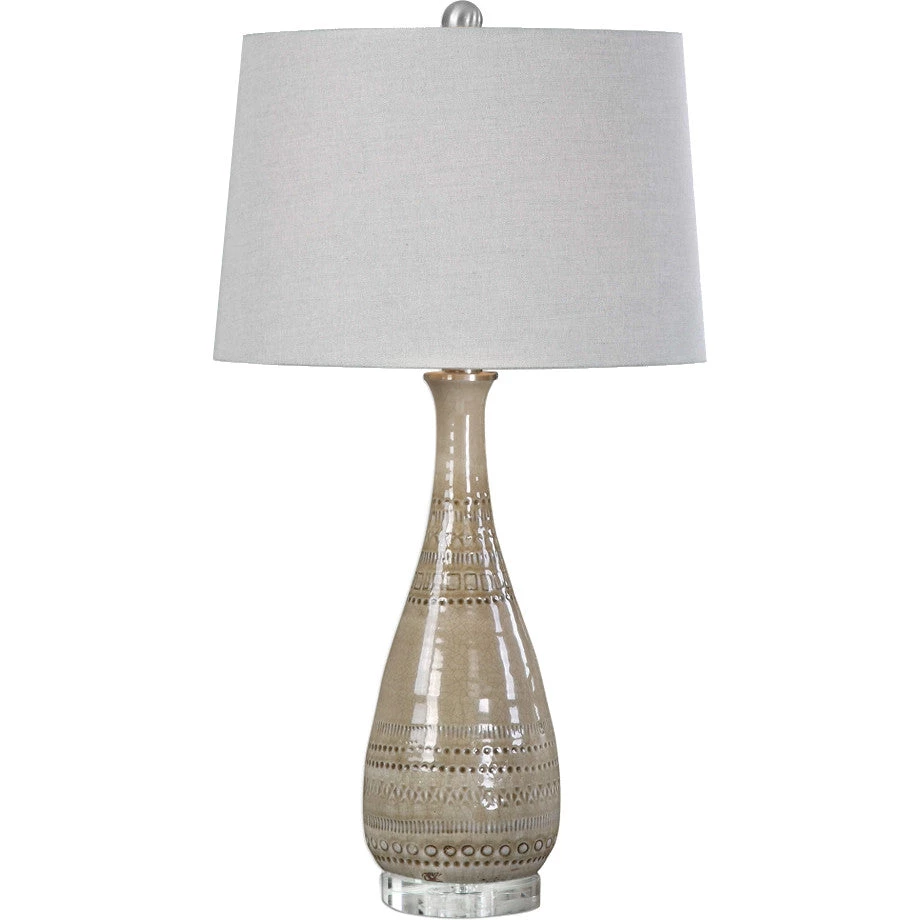 Embossed ceramic finished in a light taupe glaze accented with plated brushed nickel metal details and a thick crystal foot. The tapered round hardback shade is a light gray linen fabric. Due to the nature of fired glazes on ceramic lamps, finishes will vary slightly.