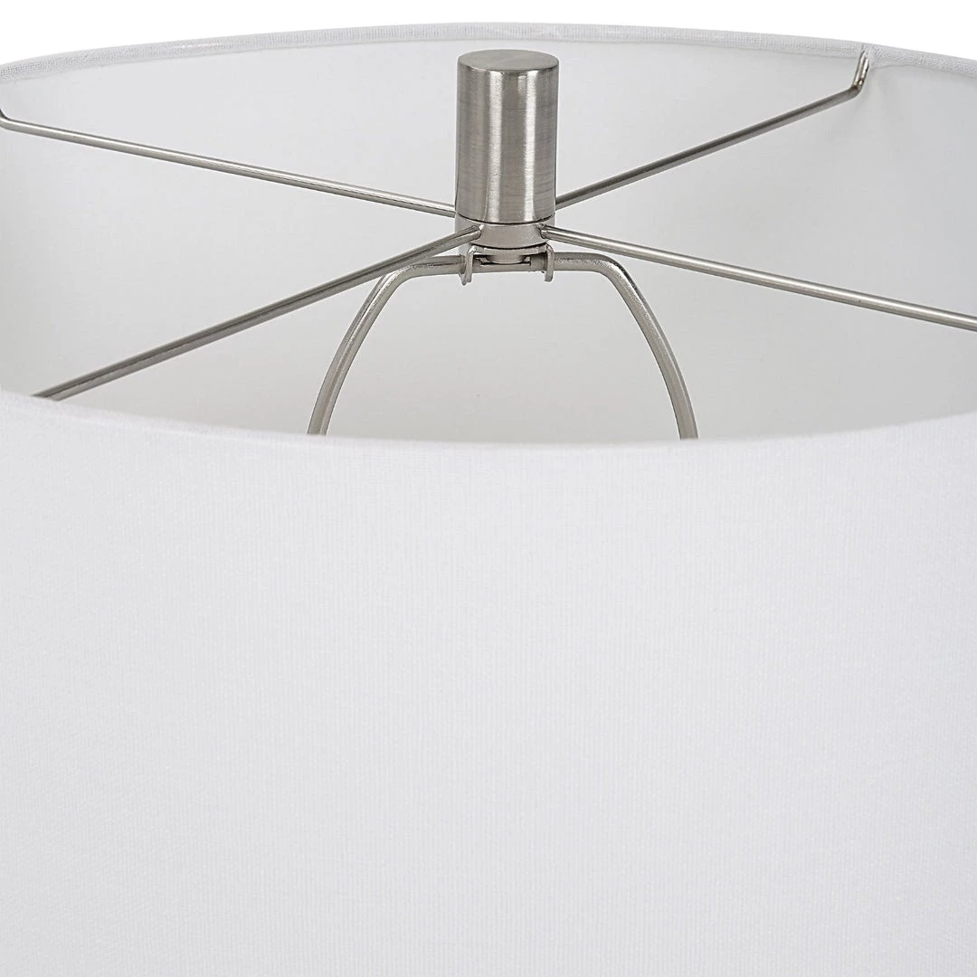 This sleek ceramic table lamp features a matte white glaze with brushed light gray detailing, paired with brushed nickel plated accents and a crystal foot. A white fabric drum shade compliments the piece.