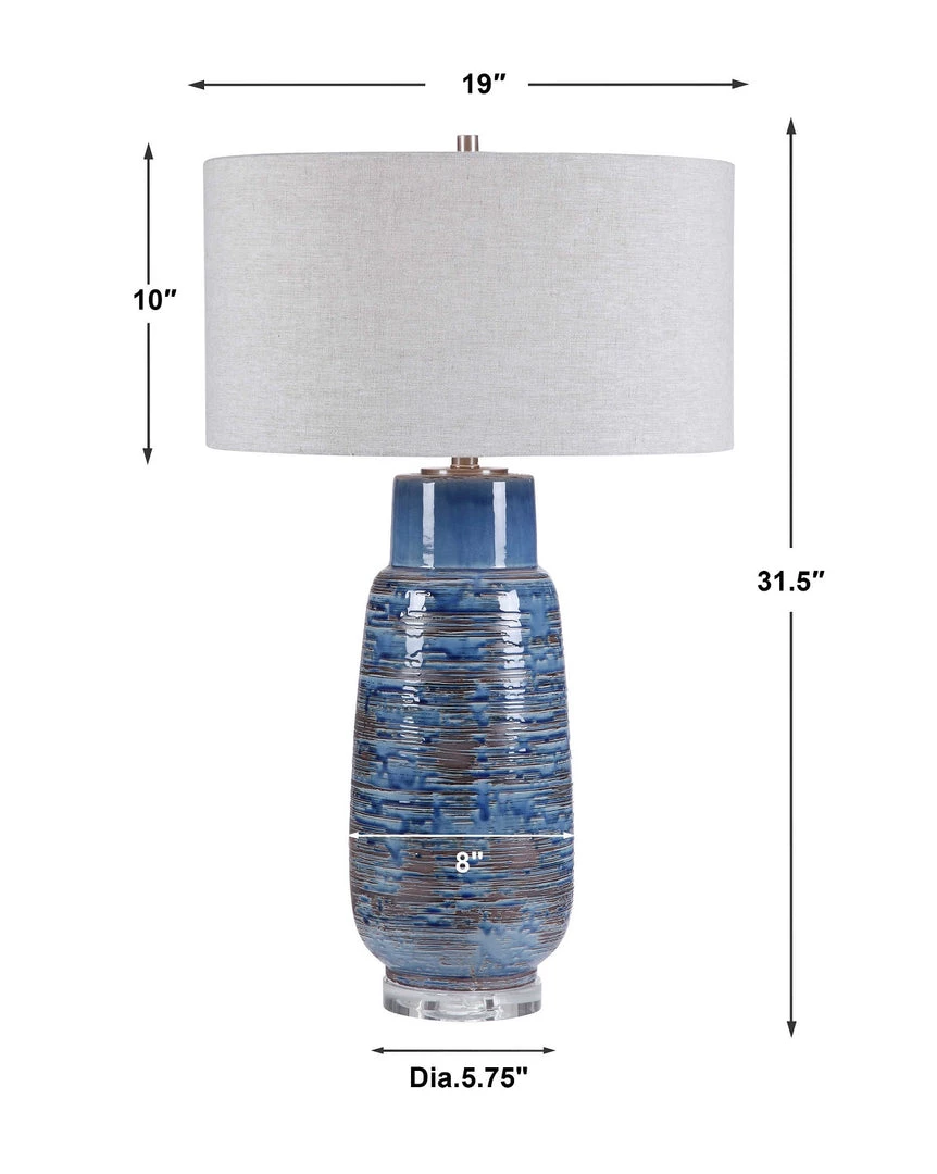This table lamp features a tall ceramic base in a heavily distressed aged indigo blue drip glaze with dark rust bronze undertones. A thick crystal foot and brushed nickel plated accents highlight the piece. The lamp has a round hardback shade in a light gray linen fabric.