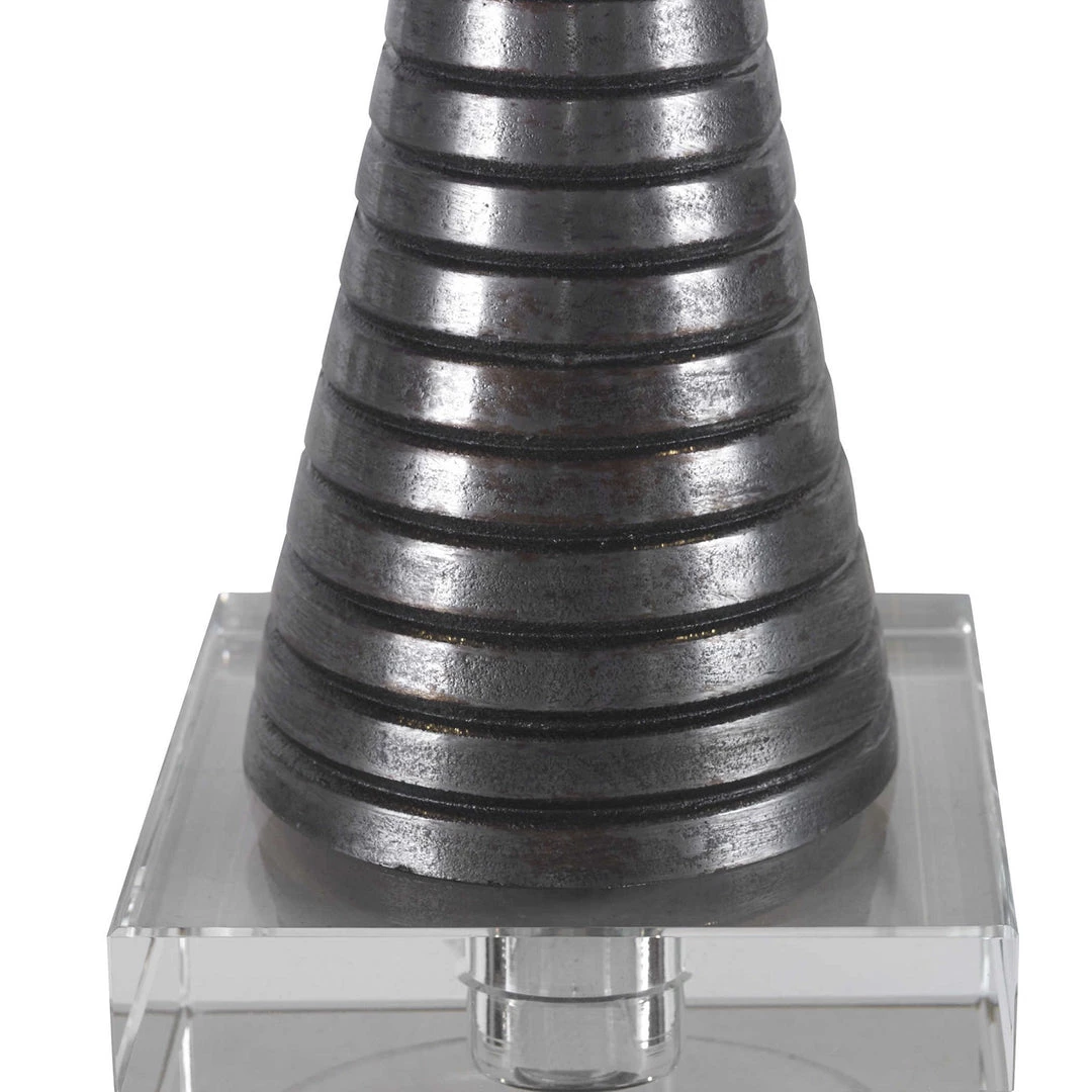 Constructed from cast iron, this table lamp features a masculine look with ribbed texture and an hourglass silhouette, displayed on a thick crystal foot. A white hardback drum shade completes the look.