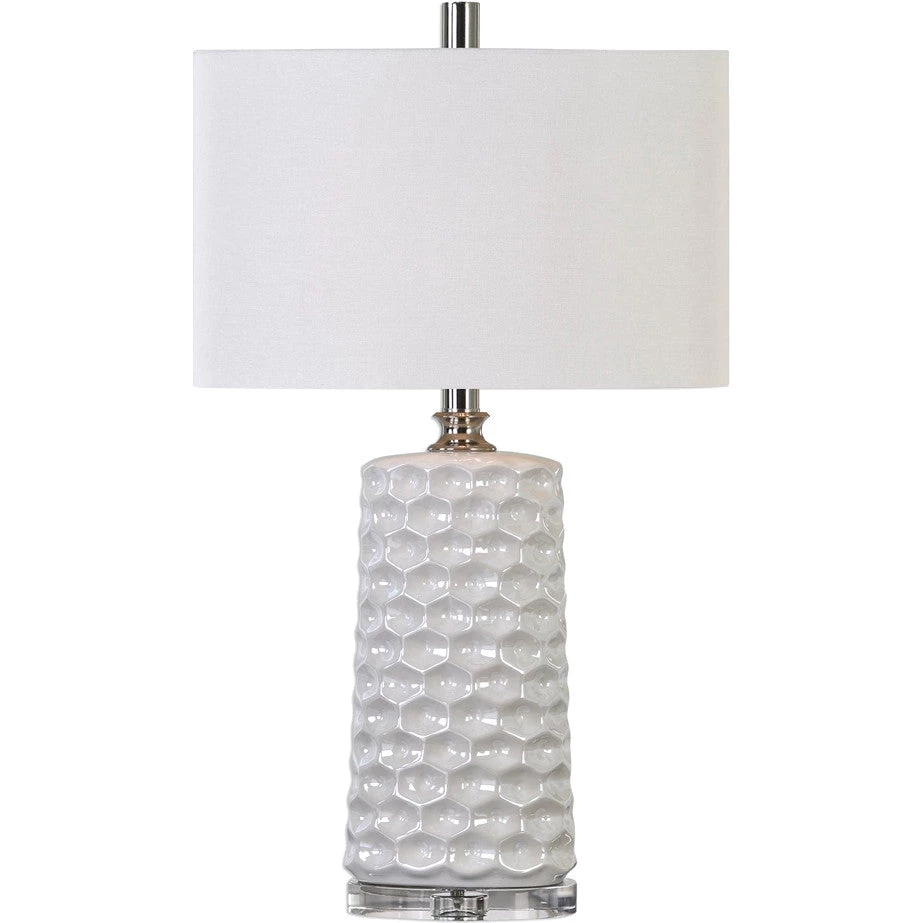 Gloss white ceramic base with a heavy honeycomb texture accented with polished nickel plated details and a crystal foot. The oval hardback shade is a white linen fabric.