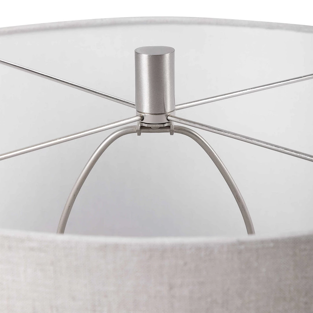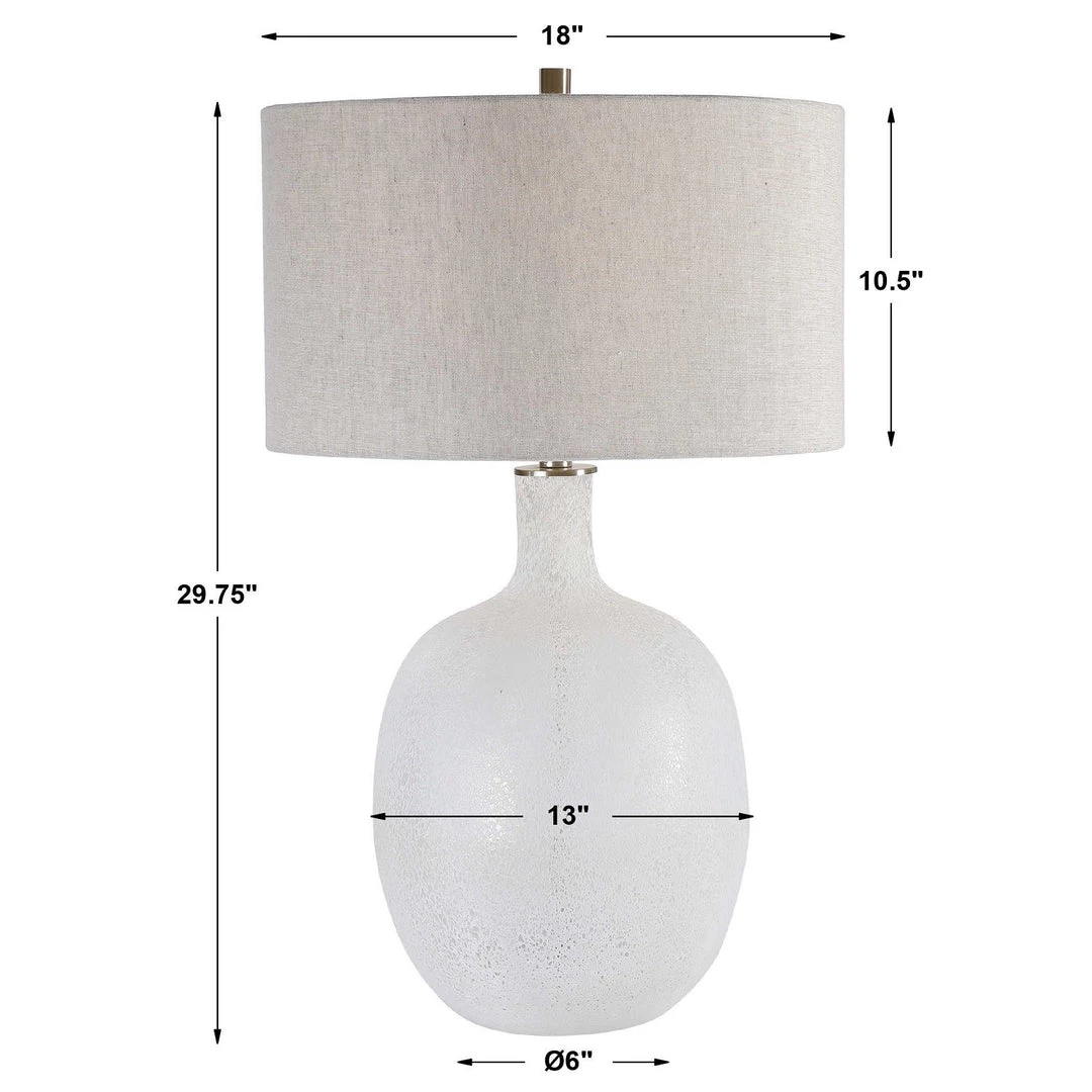 Beautiful and functional, this table lamp features a glass base finished in a heavily textured, mottled aged white, accented by brushed nickel plated details. The round hardback drum shade is a light oatmeal linen fabric with natural slubbing.