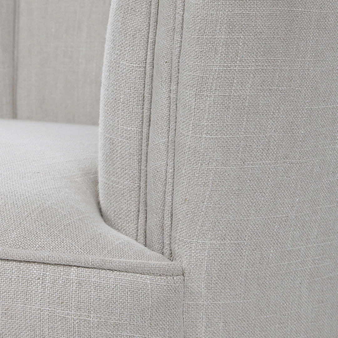 The perfect balance of retro and modern style, this welt trimmed barrel back chair is covered in a casual light tonal oatmeal fabric with channel tufting and polished nickel tapered legs.