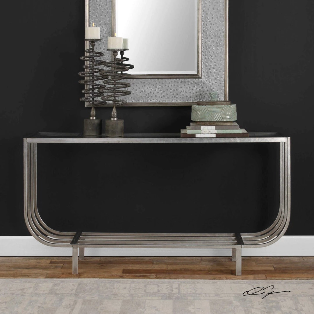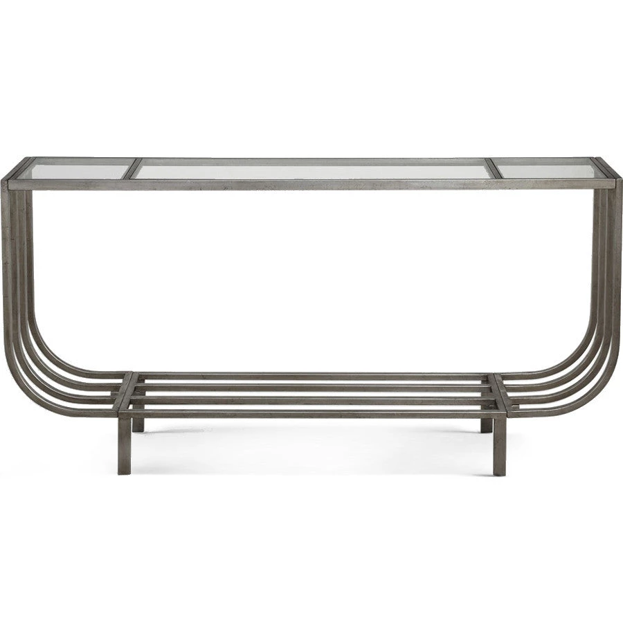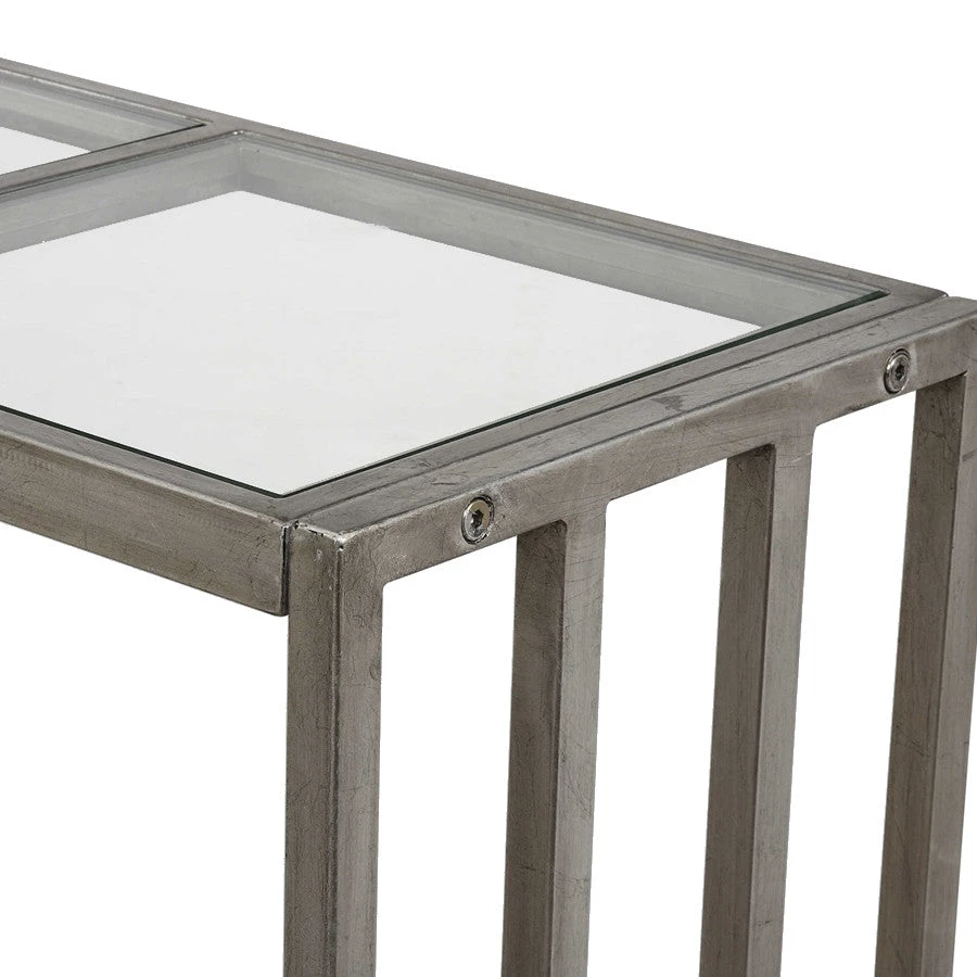 This clean lined, over-sized console table features hand forged iron in a bright silver leaf finish, with three panels of clear tempered glass.