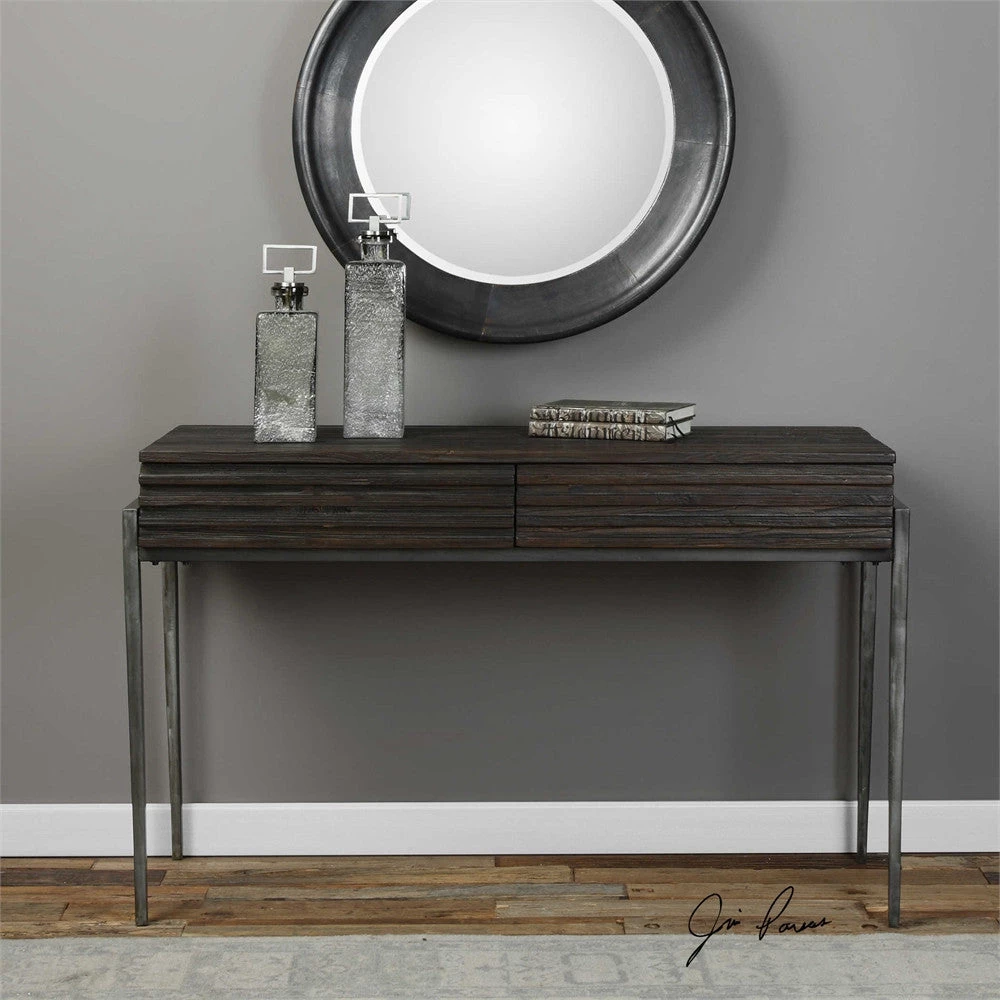 A fusion of rustic and industrial elements, this console features a grooved front with two storage drawers. Handcrafted from reclaimed pine and finished in a walnut stain with deep gray glaze resting in the grain, set in an old iron frame with tapered legs.