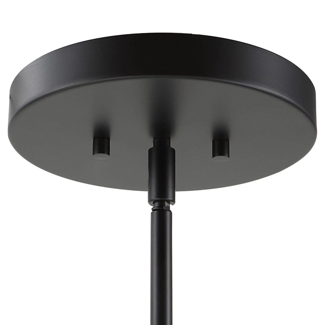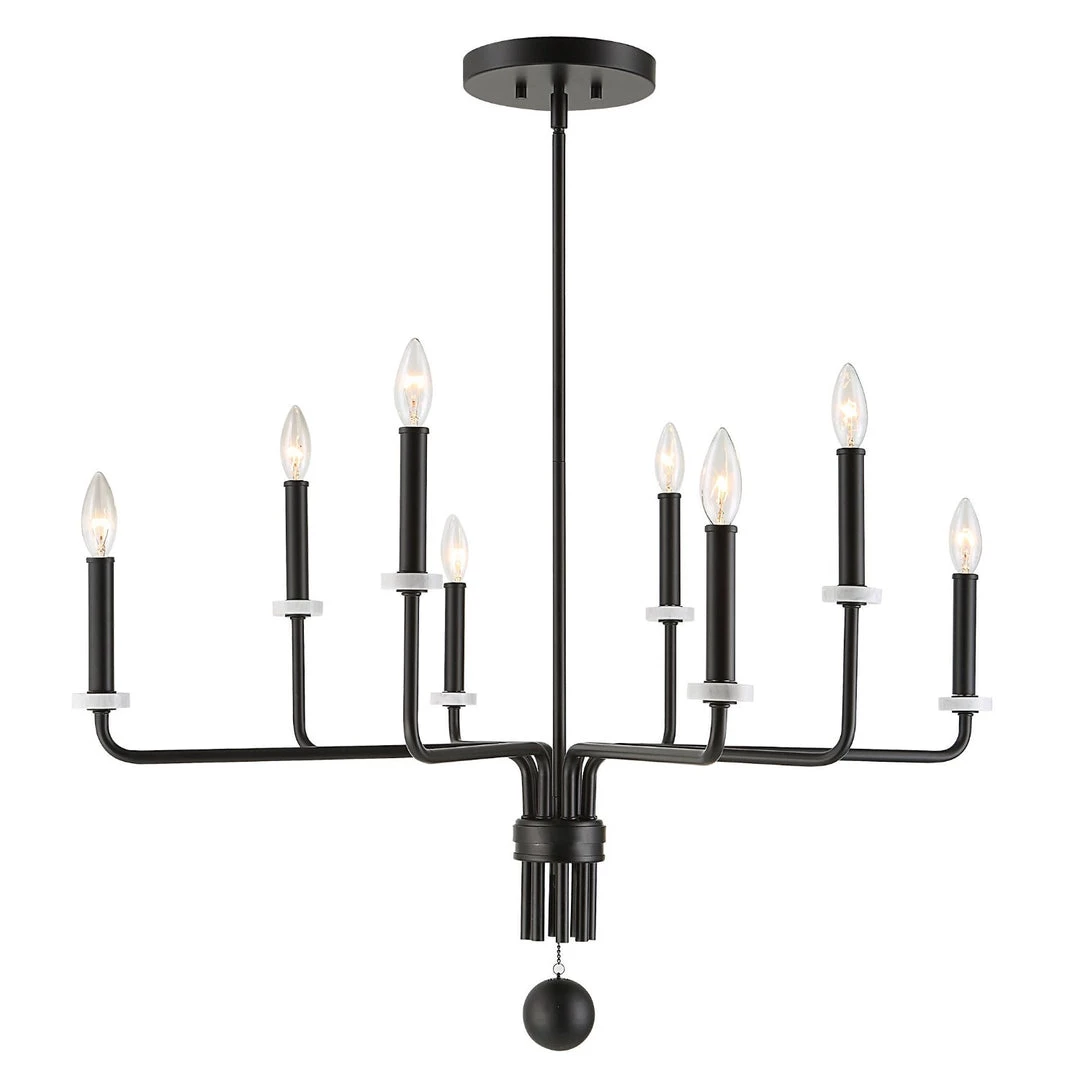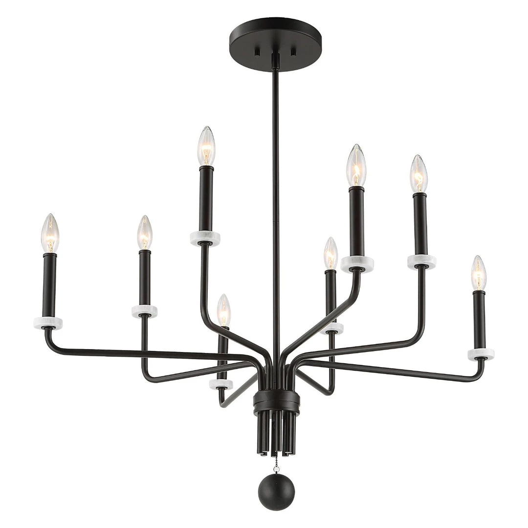 Modern and sleek softly bent lines give this 8 Lt. chandelier a dramatic feel, finished in a deep matte black with chic white marble disc bobeches.