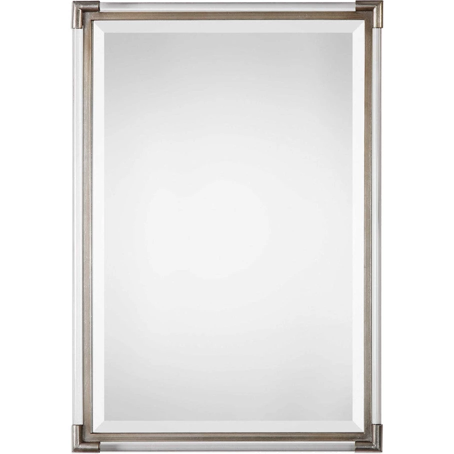 Clear acrylic rods surrounding a metallic silver leafed metal frame, creating a simple yet elegant mirror piece that adds a taste of contemporary to any room. Mirror is beveled.