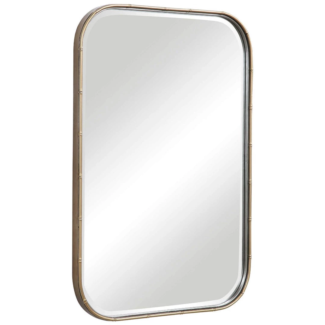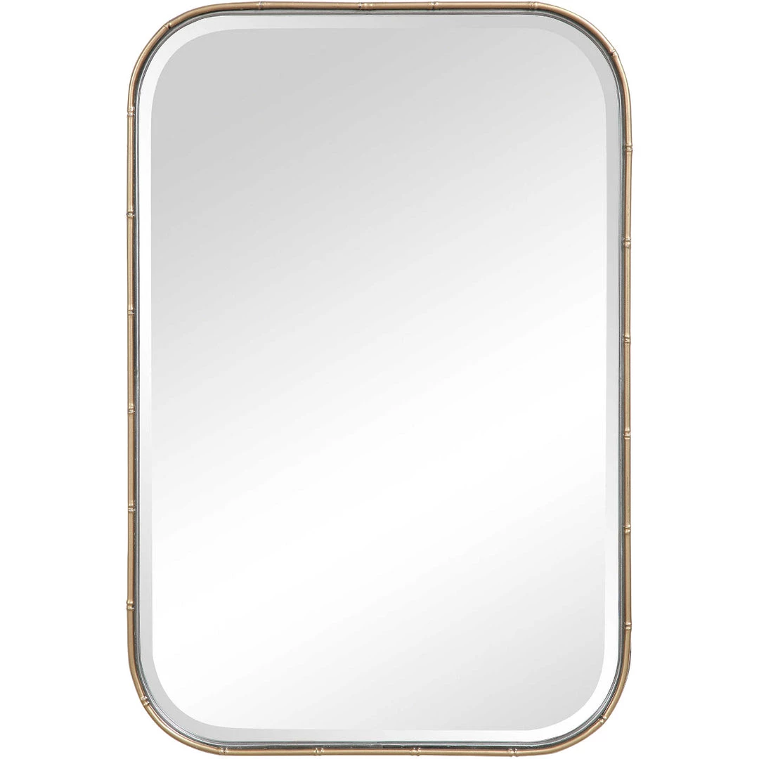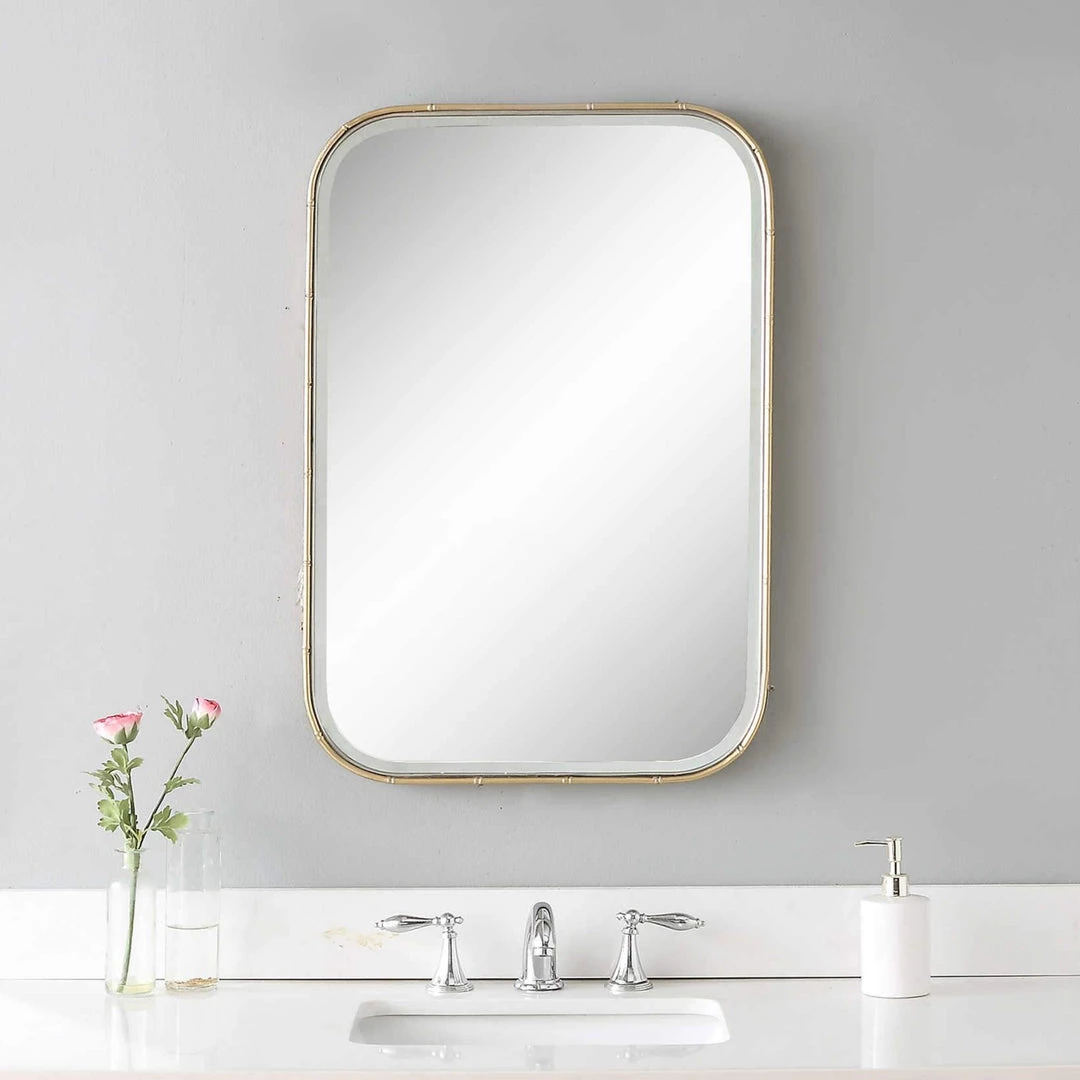 A nod to classic Chinoiserie style, this vanity mirror has a petite iron frame with a bamboo design finished in antique gold leaf.