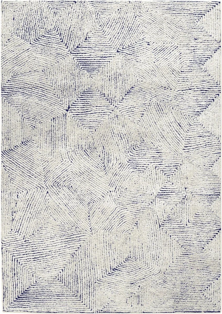 Hand tufted ivory wool and rescued denim with a plush cut pile.