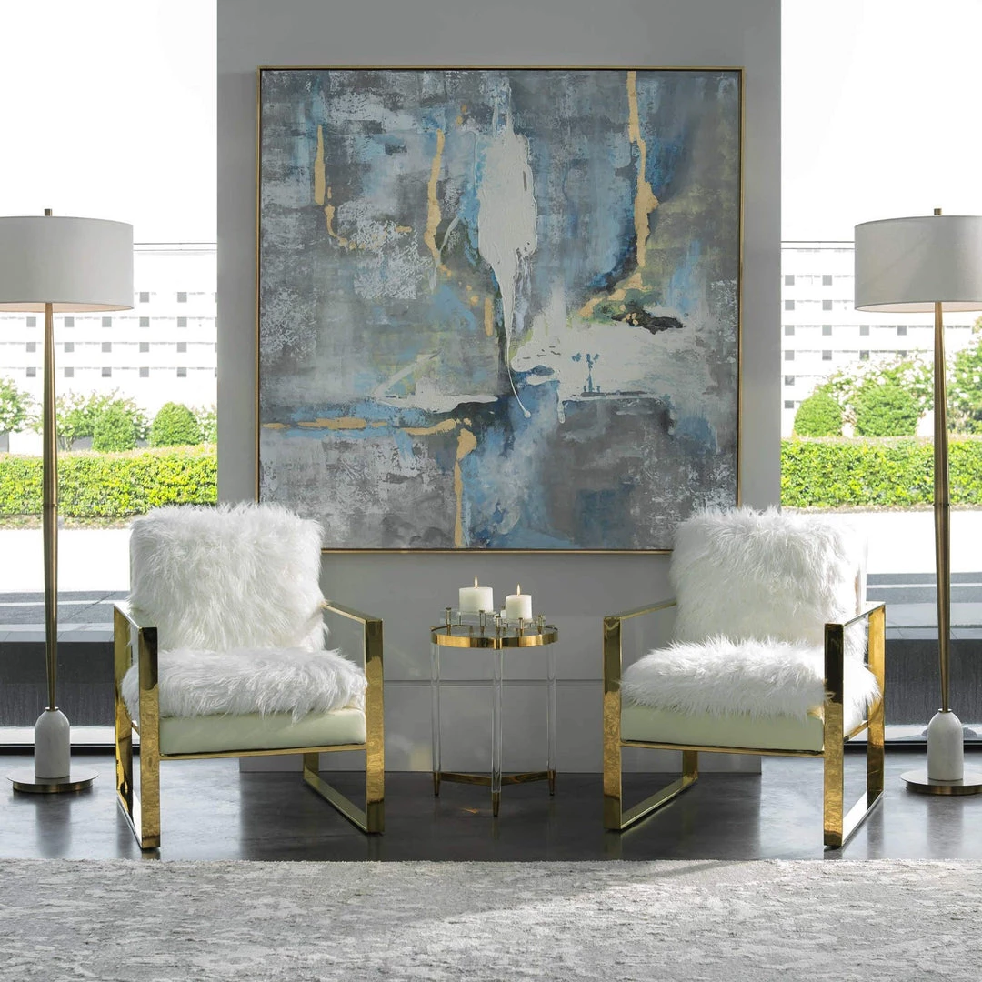 This hand painted abstract on canvas makes a bold statement in bright blue shades are complimented by wide, white and gray brushstrokes and bright gold leaf accents. A petite, gold gallery frame surrounds the canvas, which has been stretched and applied to a wooden frame.