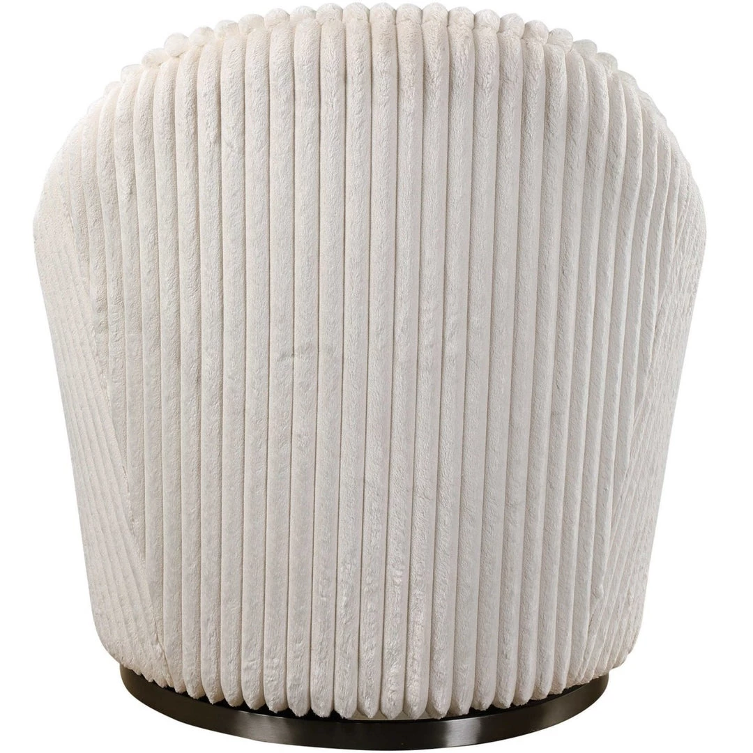 This refined swivel chair envelopes you in luxury and comfort with plush fluted ivory sherpa chenille fleece upholstery, a beautifully contoured back, and ample foam and fiber padding. The brushed black nickel stainless steel swivel base contrasts beautifully with the upholstery.