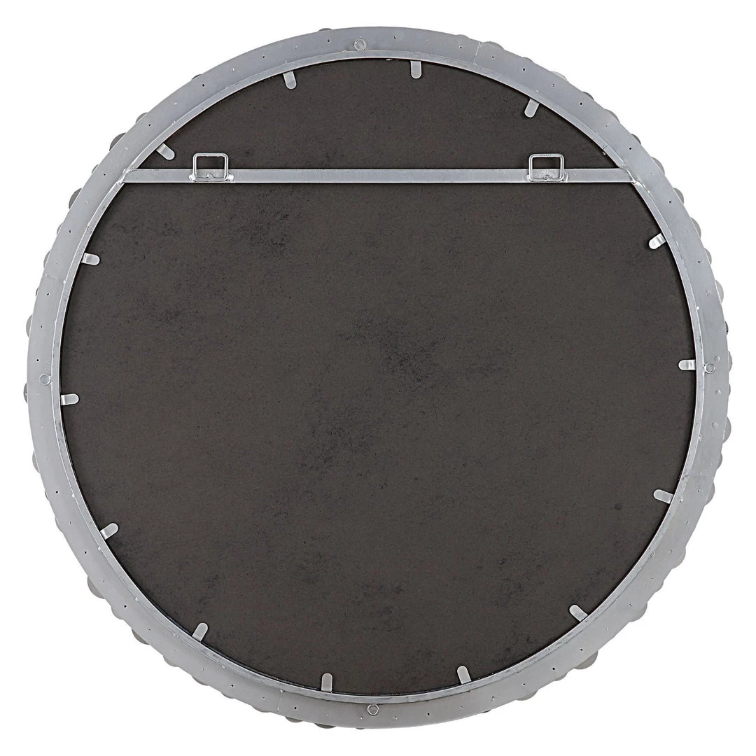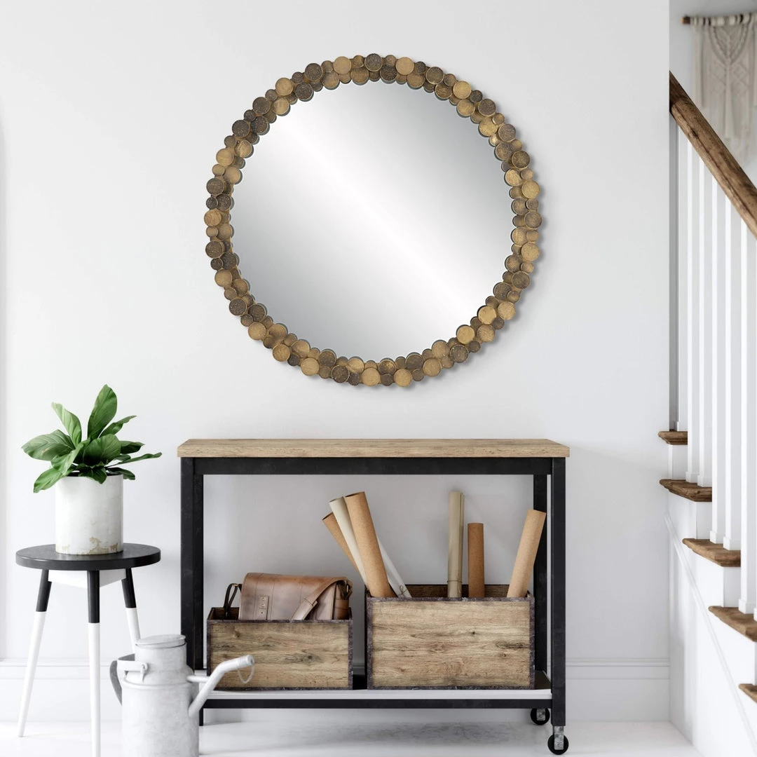 This round mirror features an iron frame with 3-dimensional, floating, overlapping medallions finished in metallic aged gold with some heavily burnished for a multi tone effect.