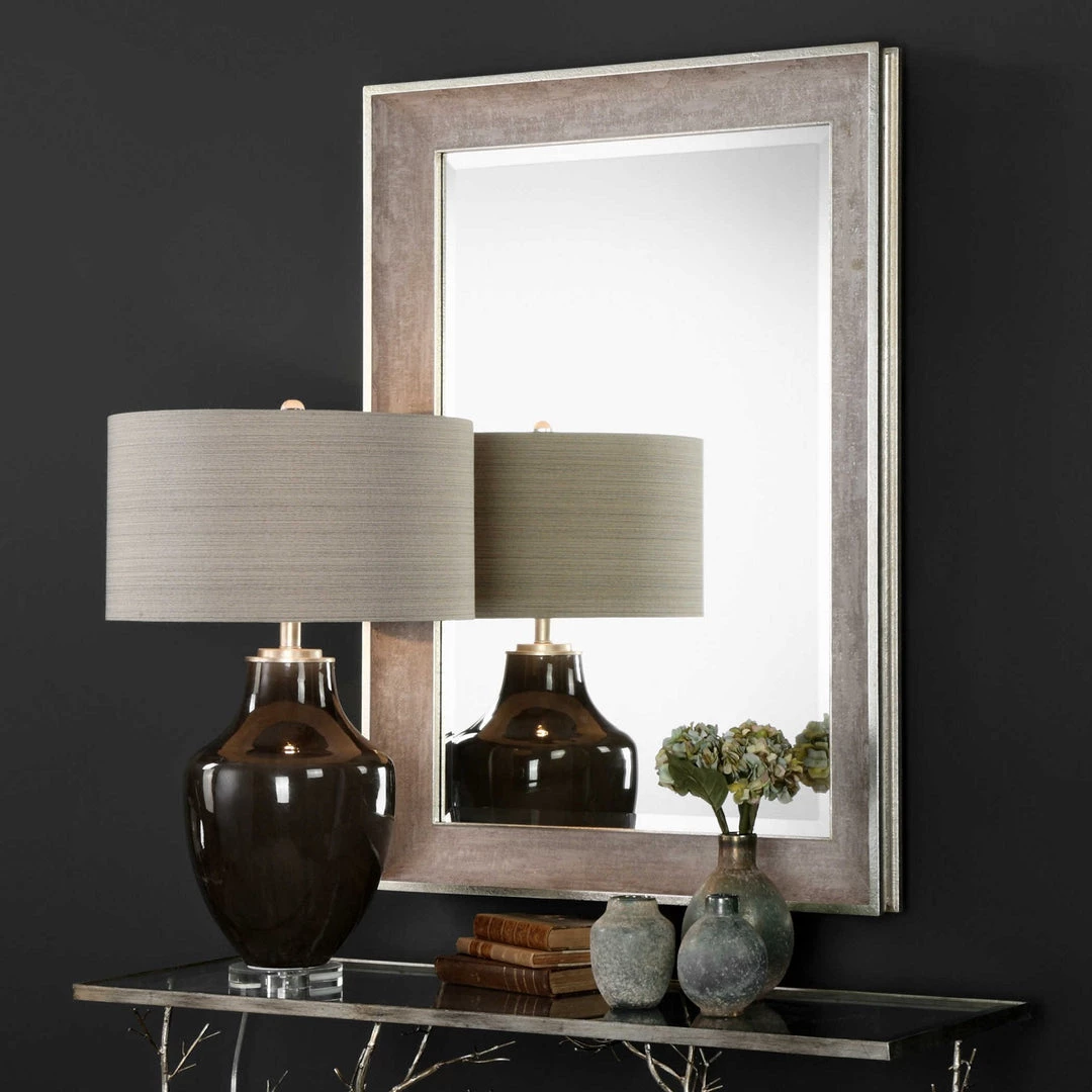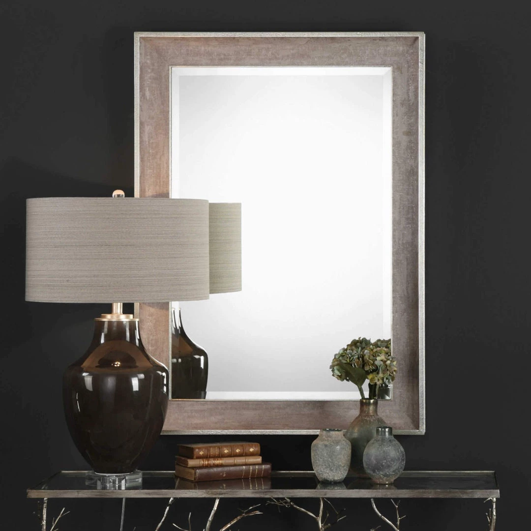 The solid pine frame of the Corrado features a sloped profile with a heavily textured warm gray wrapped finish for a rustic appearance. Accented with metallic silver inner and outer edges, this mirror features a generous 1 1/4″ bevel.