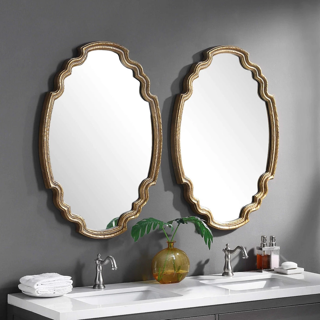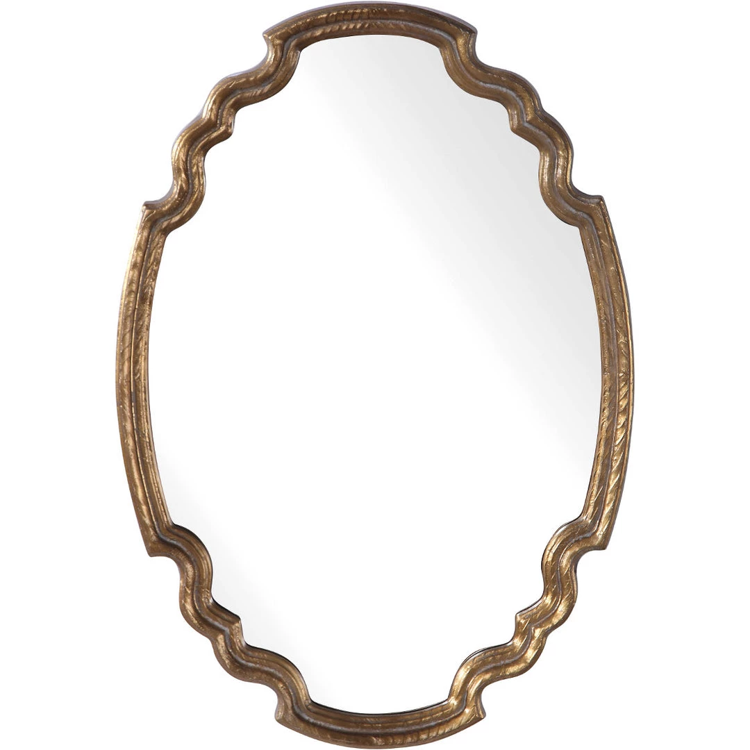 Finished in gold leaf, this oval mirror adds feminine style to a space with its curved frame and French glam design.