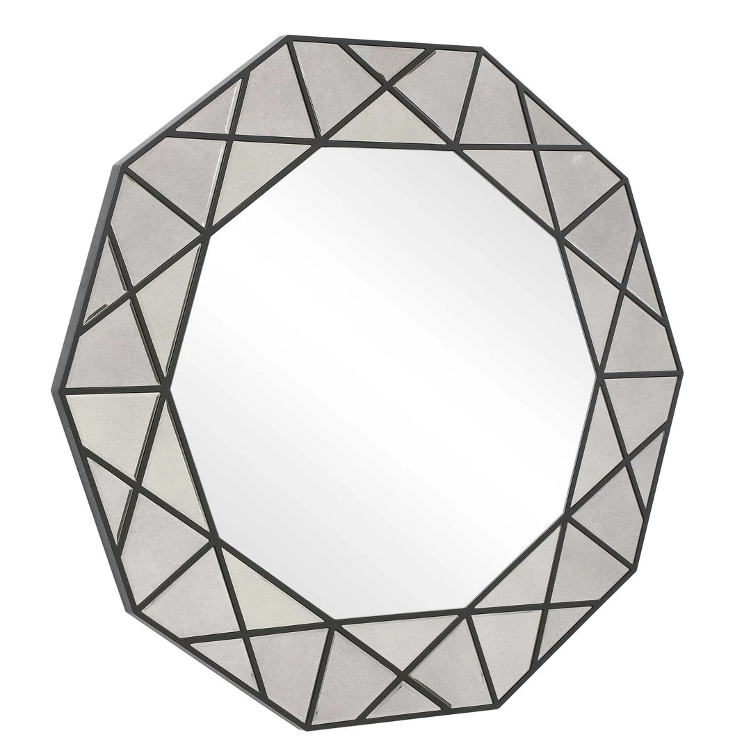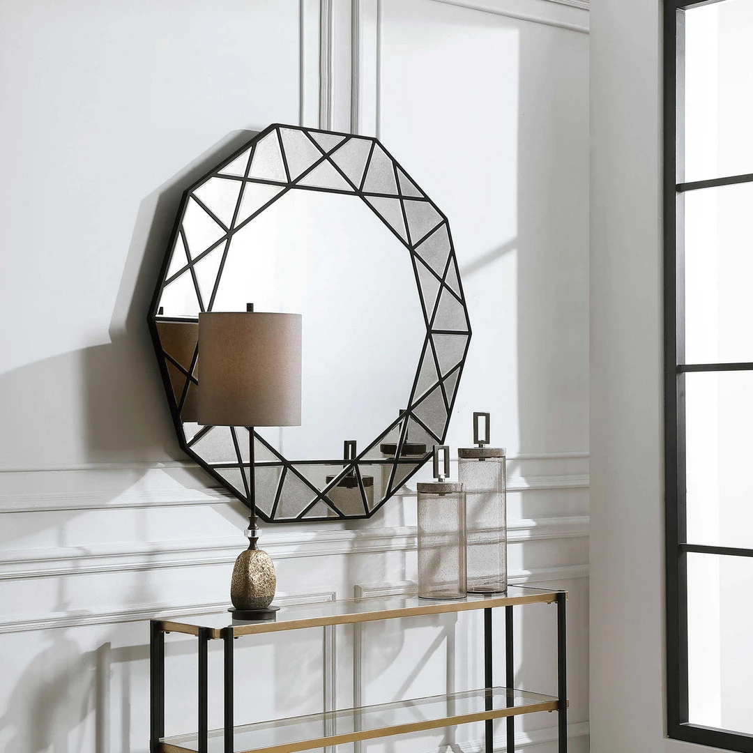 Loosely based on a stained glass window design, this decagon shaped mirror features clean lines finished in matte black. This contemporary design instantly creates a unique focal point in your space.