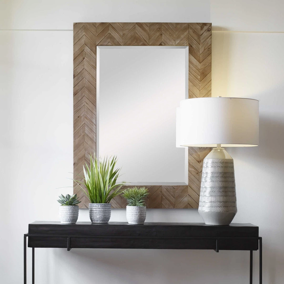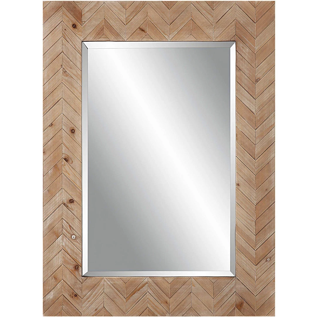 This mirror features a chevron patterned, natural pine wood frame finished with a light gray glaze. Mirror has a generous 1 1/4″ bevel.