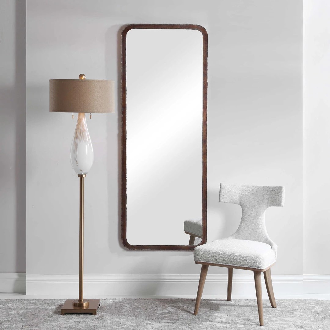 Featuring a hand forged iron construction, this rustic mirror design is finished in oxidized copper bronze with a continuous weld bead edge.