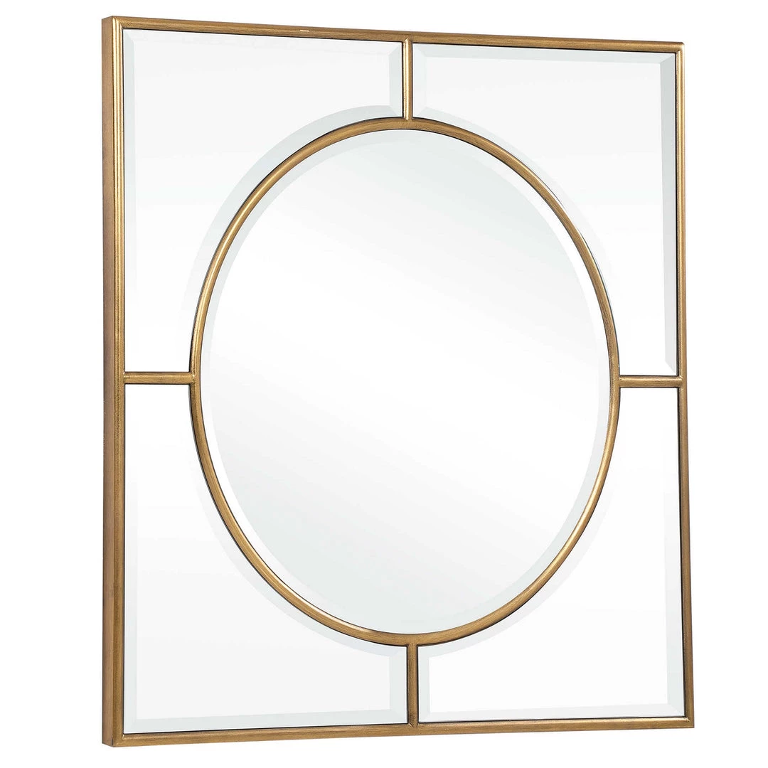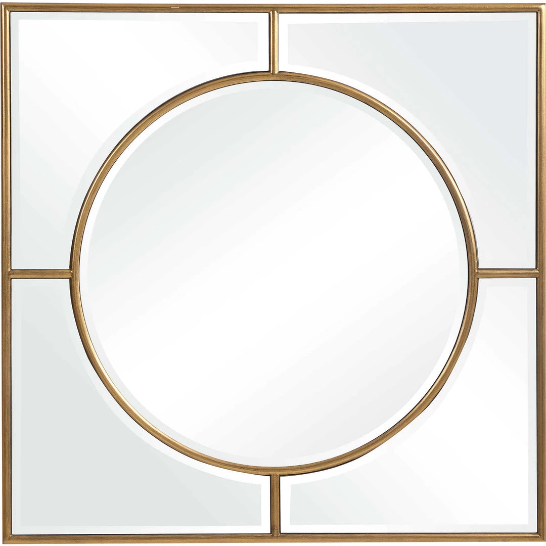 Showcasing a refined traditional style, this square mirror features a classic brushed gold finish with curved beveled mirrors. Group multiple pieces together to create an eye catching wall display.