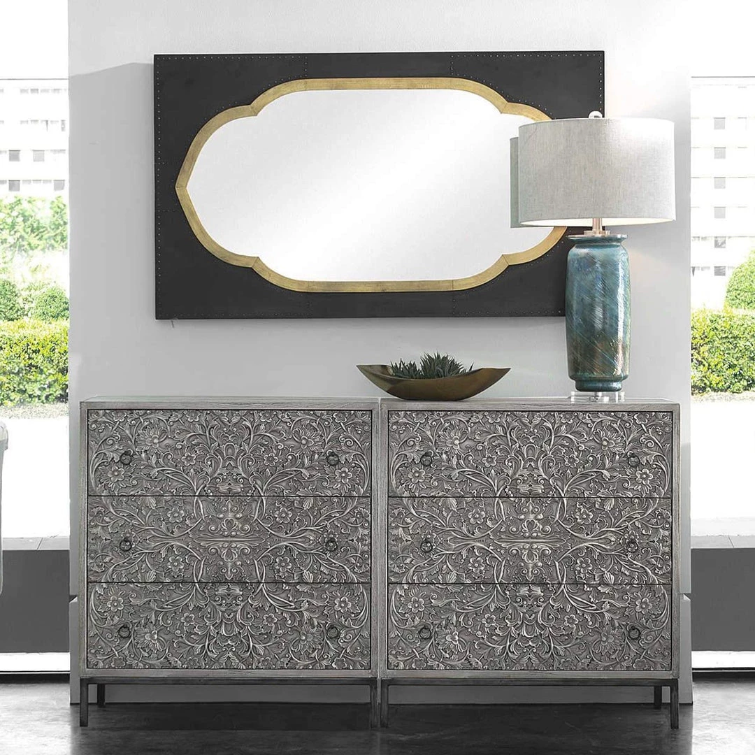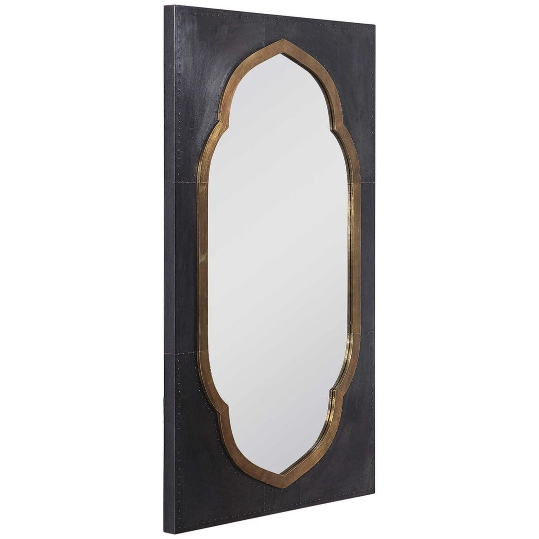 This Moroccan mirror design is constructed using a solid wood frame cladded in copper sheeting that’s finished in a lightly oxidized dark bronze accented with a metallic gold inner edge.