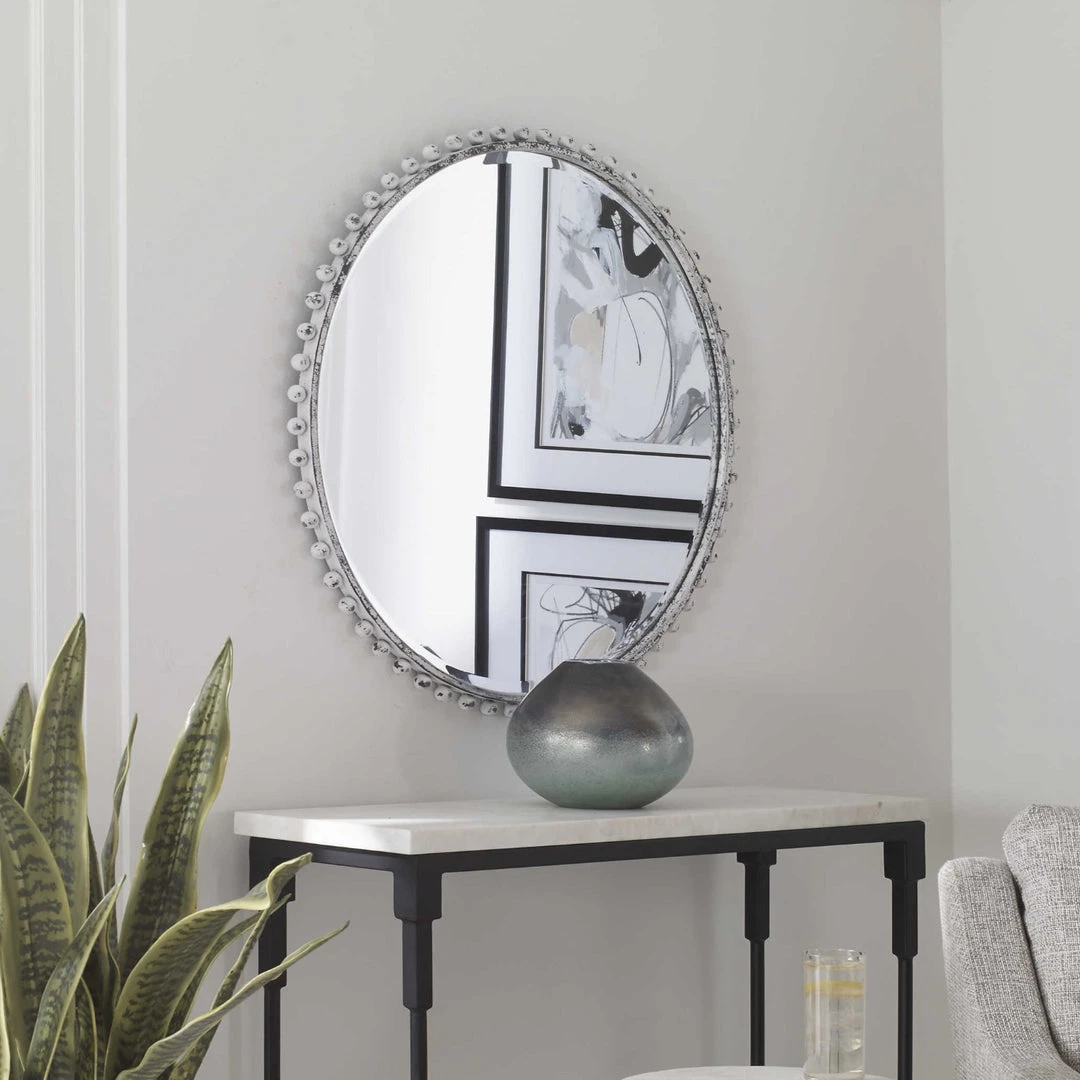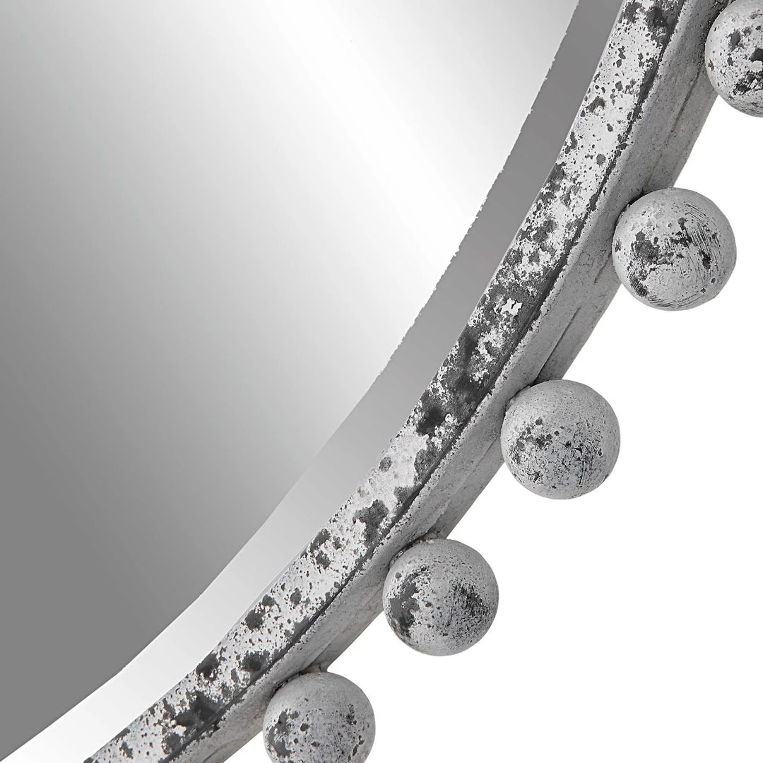 Petite iron spheres line the outer edge of this round frame, finished in a heavily distressed aged white with rustic black undertones. Mirror features a generous 1 1/4″ bevel.