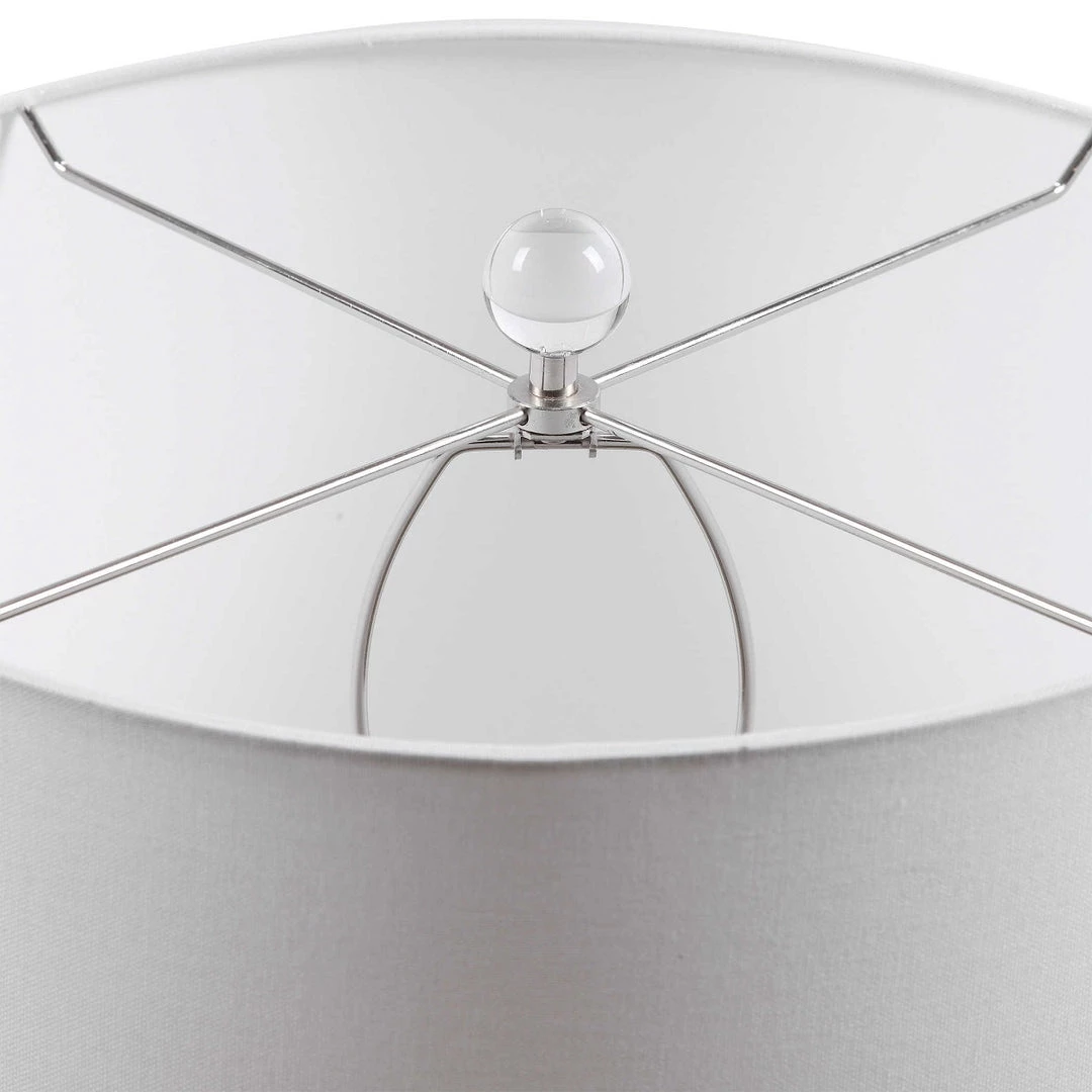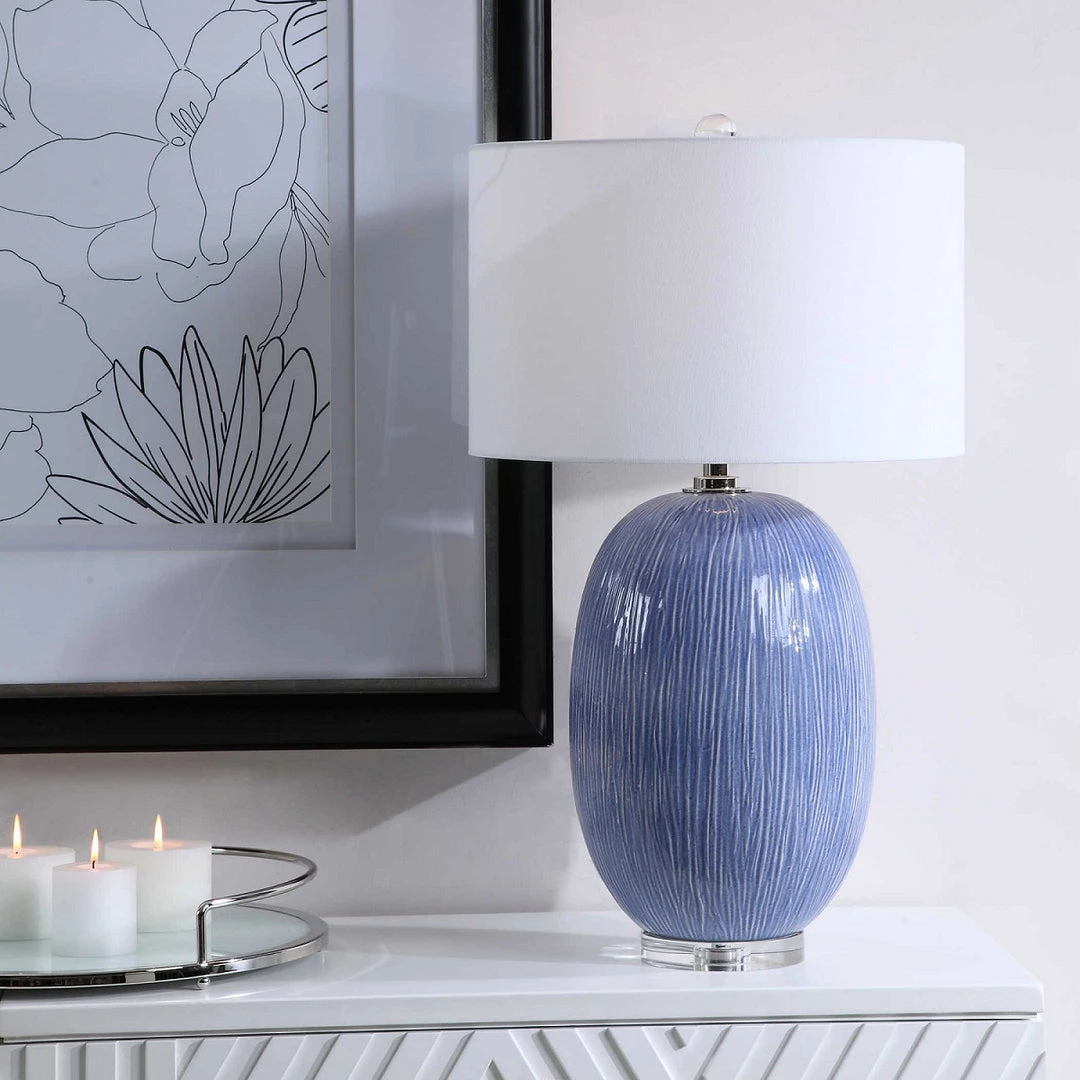 This refined table lamp features a classic blue ceramic base with white subtle undertones and organic vertical texture, paired with sophisticated polished nickel and crystal accents. The round hardback drum shade in a white linen fabric.