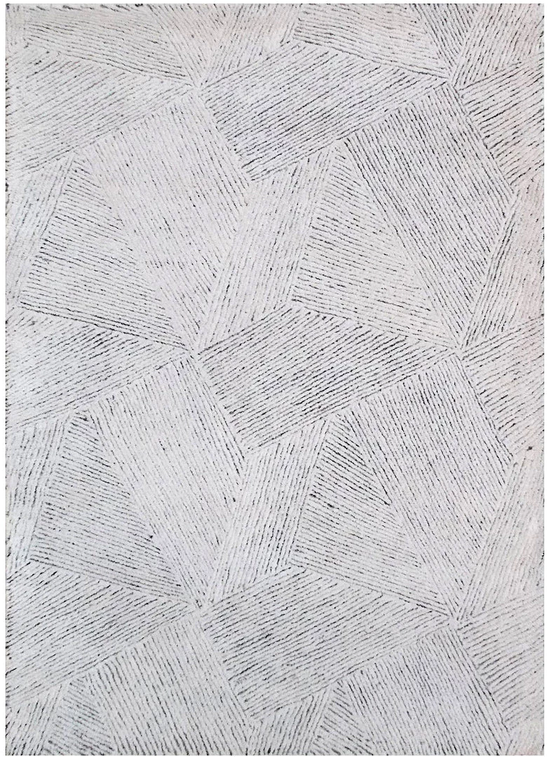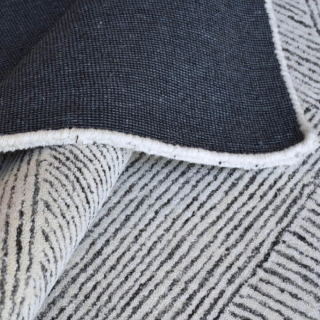 This hand tufted rug features geometric patterns with linear details in ivory and gray wool in a medium cut pile.