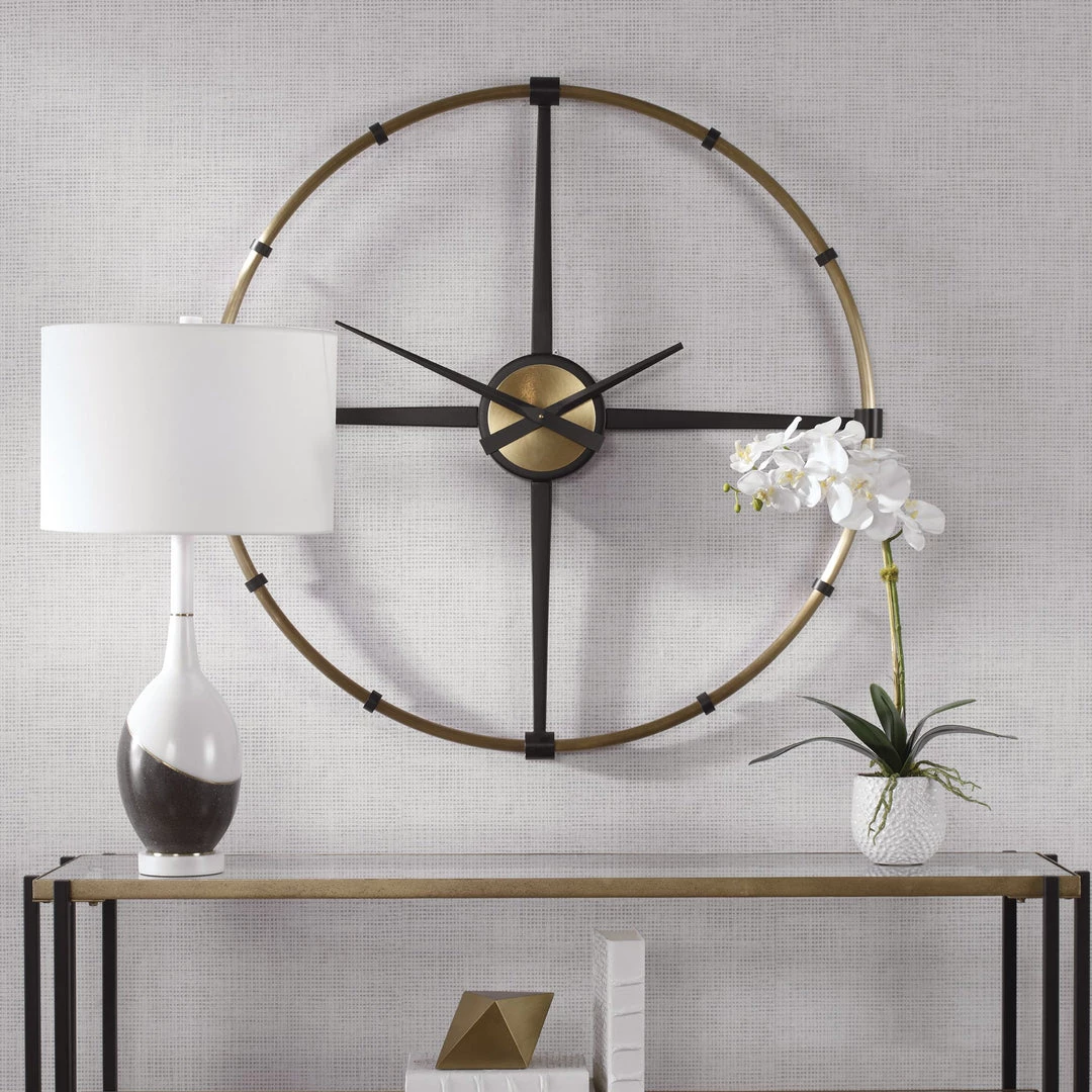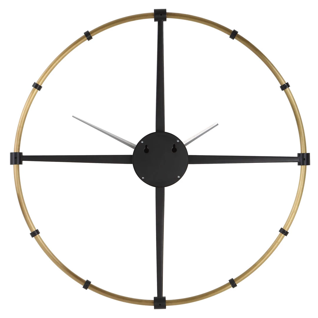 Wall clock features a solid iron frame finished in antique brushed brass and satin black for a modern industrial feel. Quartz movement ensures accurate timekeeping.